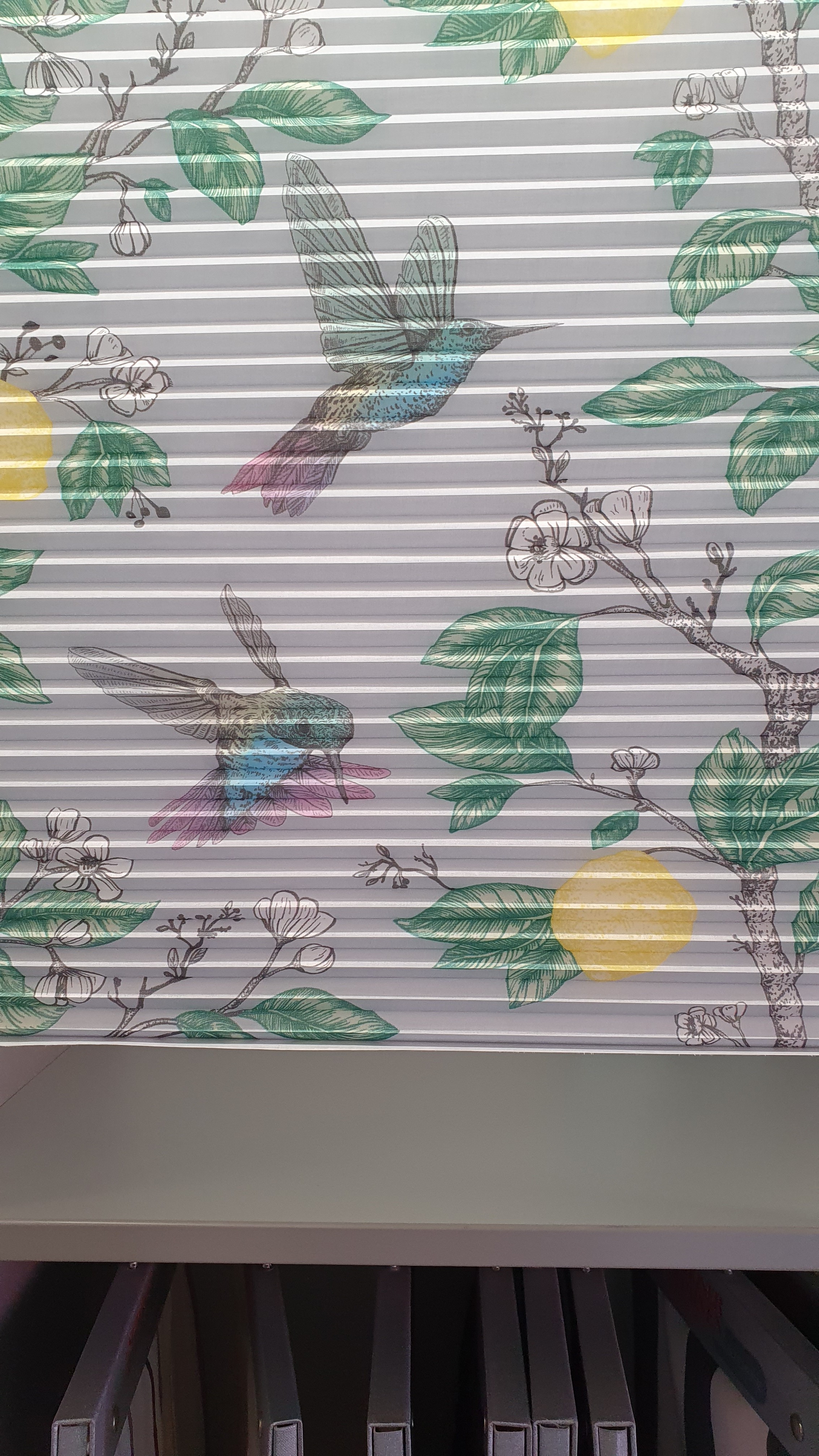 We had already chosen some designs for the two rooms, but needed to check that these were suitable: privacy in the bathroom and darkness in the bedroom, which gets the morning sun. Turns out, of course, we hadn’t chosen the best styles for the job. So we went though the catalogue together and came up with two fairly neutral designs that should hopefully not clash with anything in the rooms. We also chose the style for my office, where the sun is a distraction in the winter.
