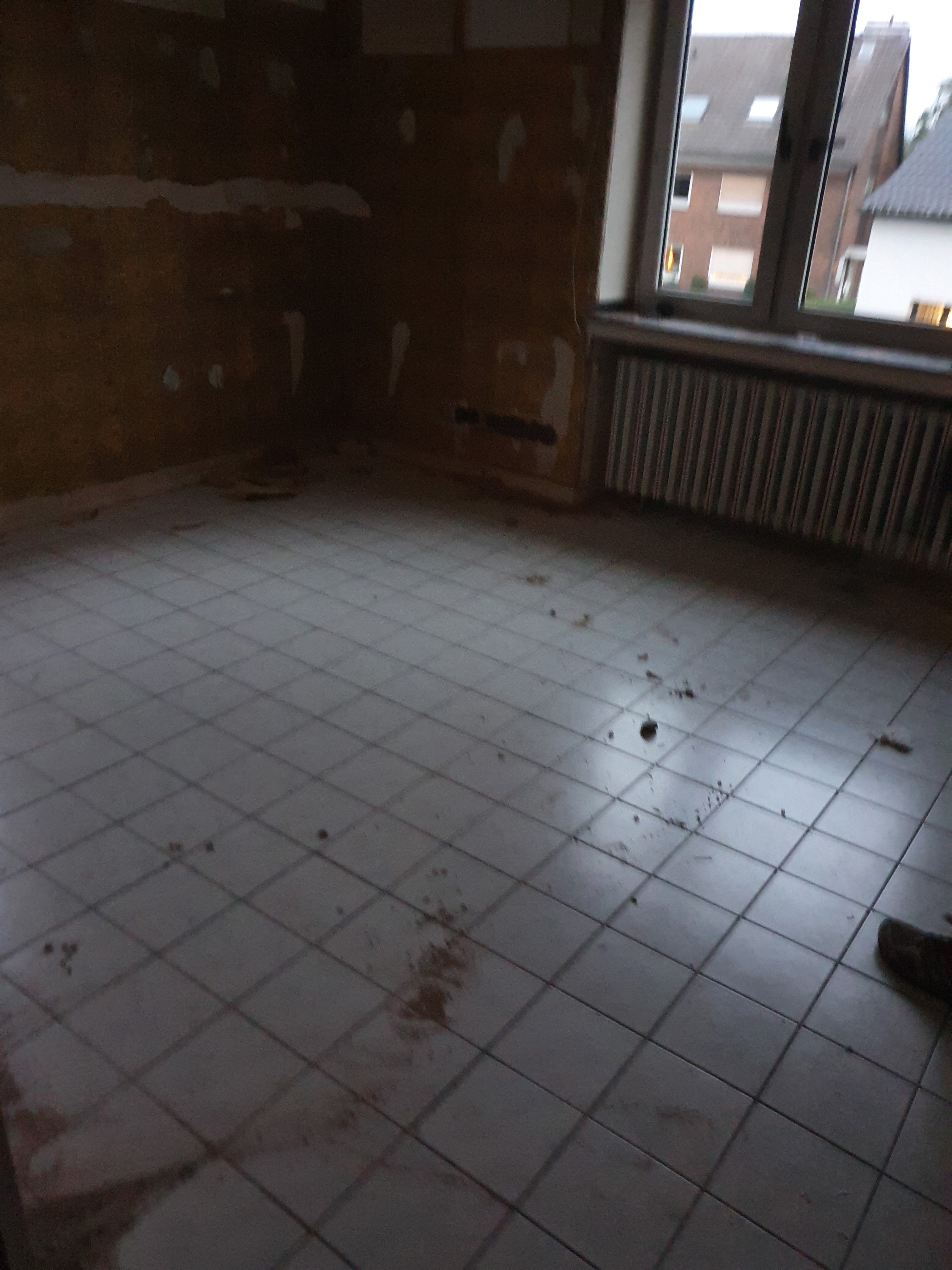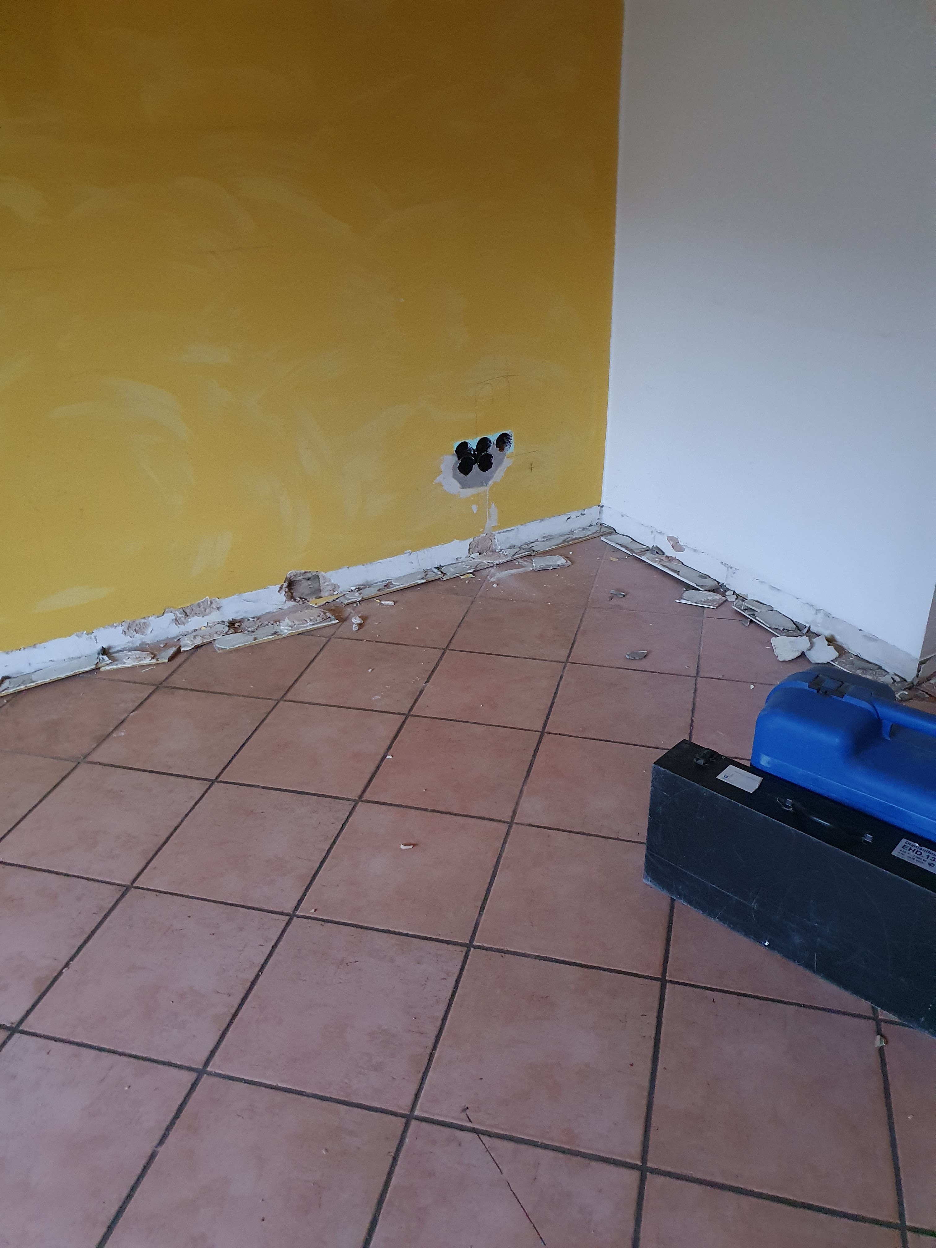 We arranged to meet this evening and get started. And, boy, did we. Not only was the kitchen removed, but we also got rid of most of the skirting tiles downstairs, and the tiles in the kitchen itself. Power tools galore!