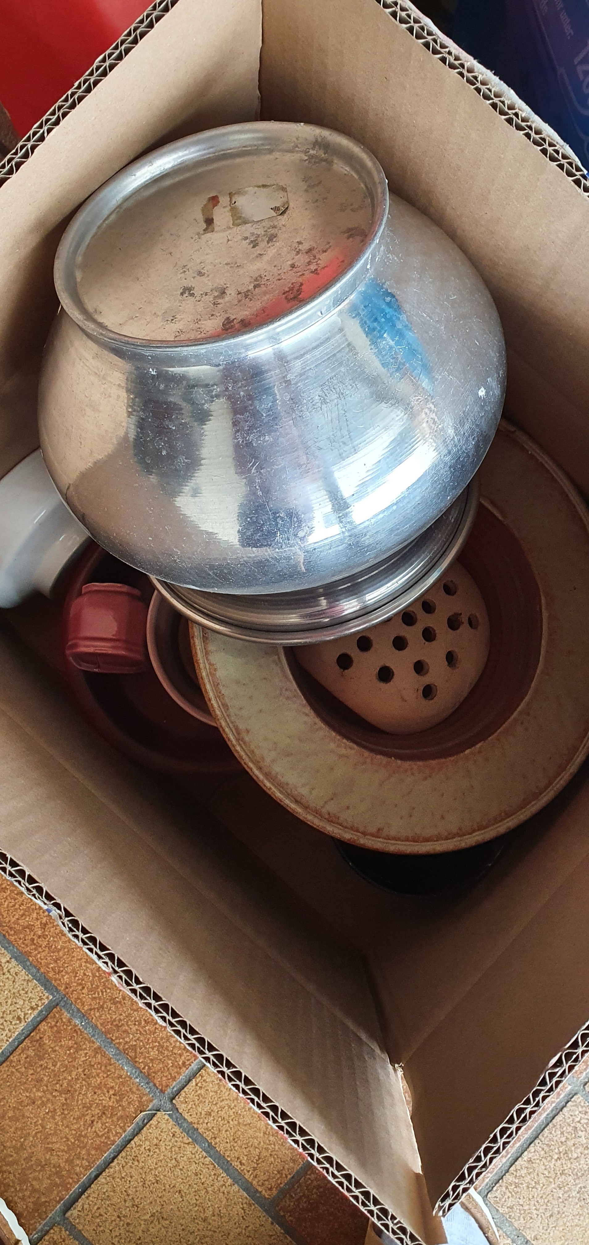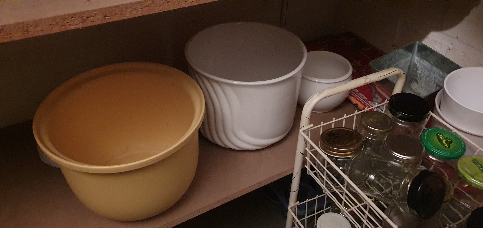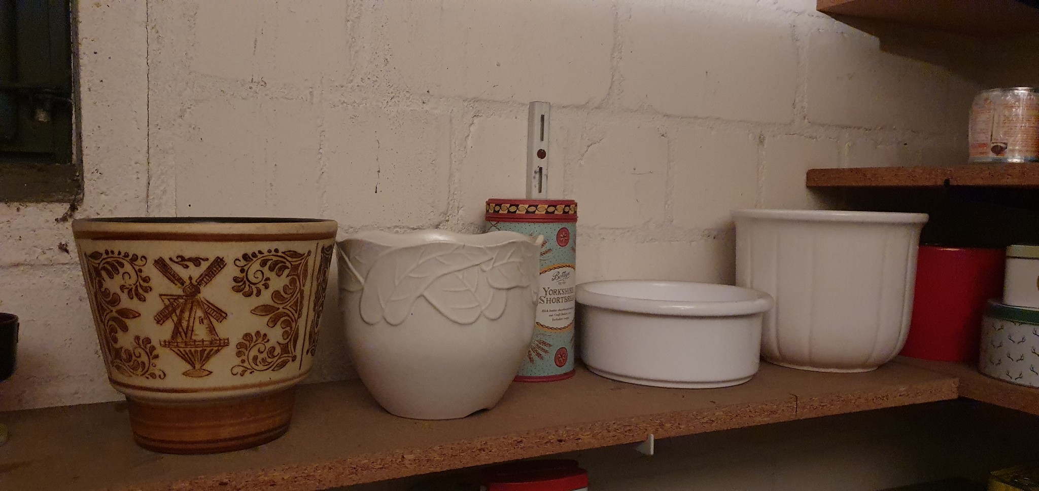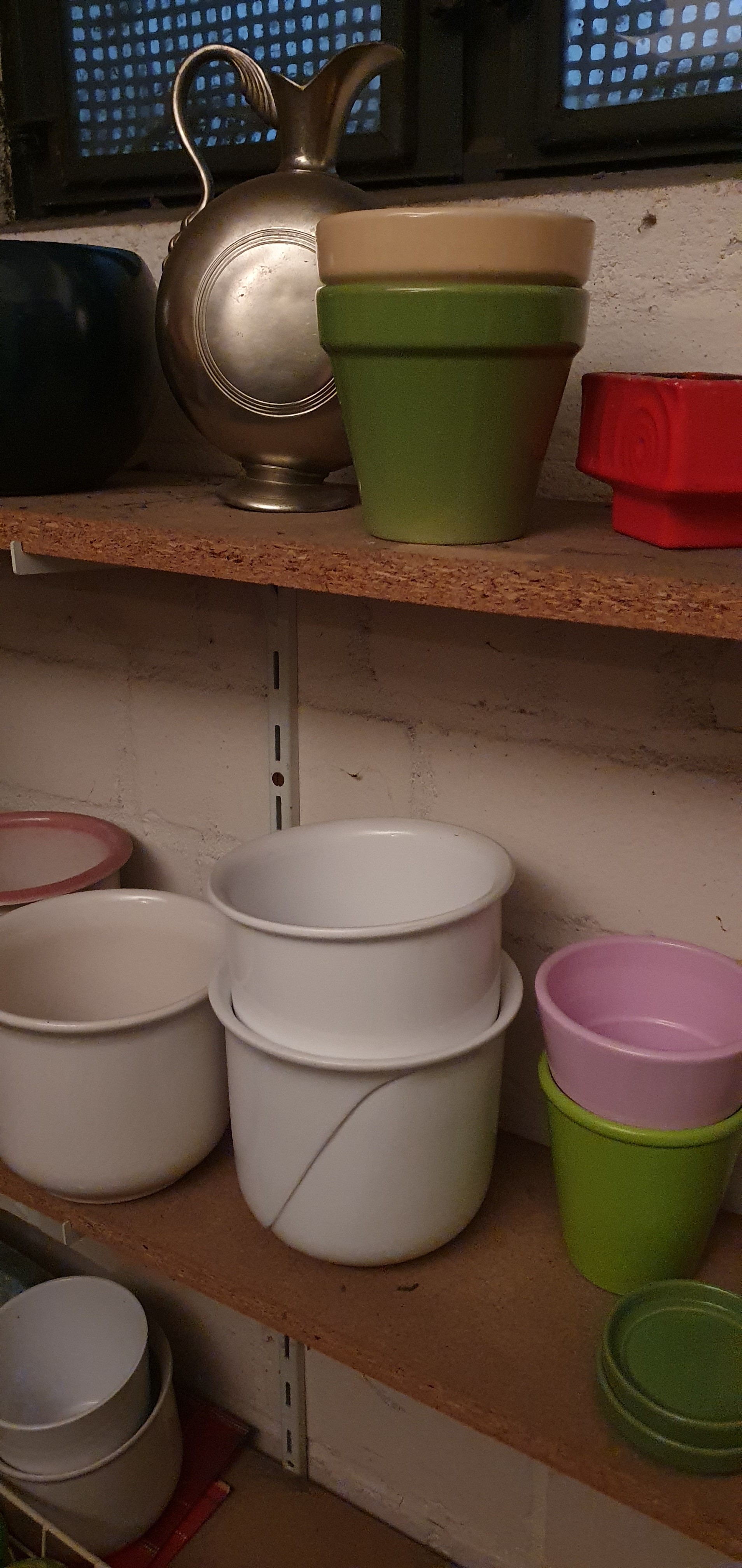 Langweilig wird es nicht. Im Garten kann ich nicht arbeiten und daher widme ich mich dem Vorratskeller. Hier hat meine Mutter sämtliche Übertöpfe gelagert, die sie jemals mit Blumen geschenkt bekommen hat. Deutlich auch seit den 70 er Jahren gesammelt. Und ich muss jetzt entrümpeln. Ich bin nicht wirklich ein Fan von Übertöpfen. Da fällt mir diesmal so manche Entscheidung leichter.