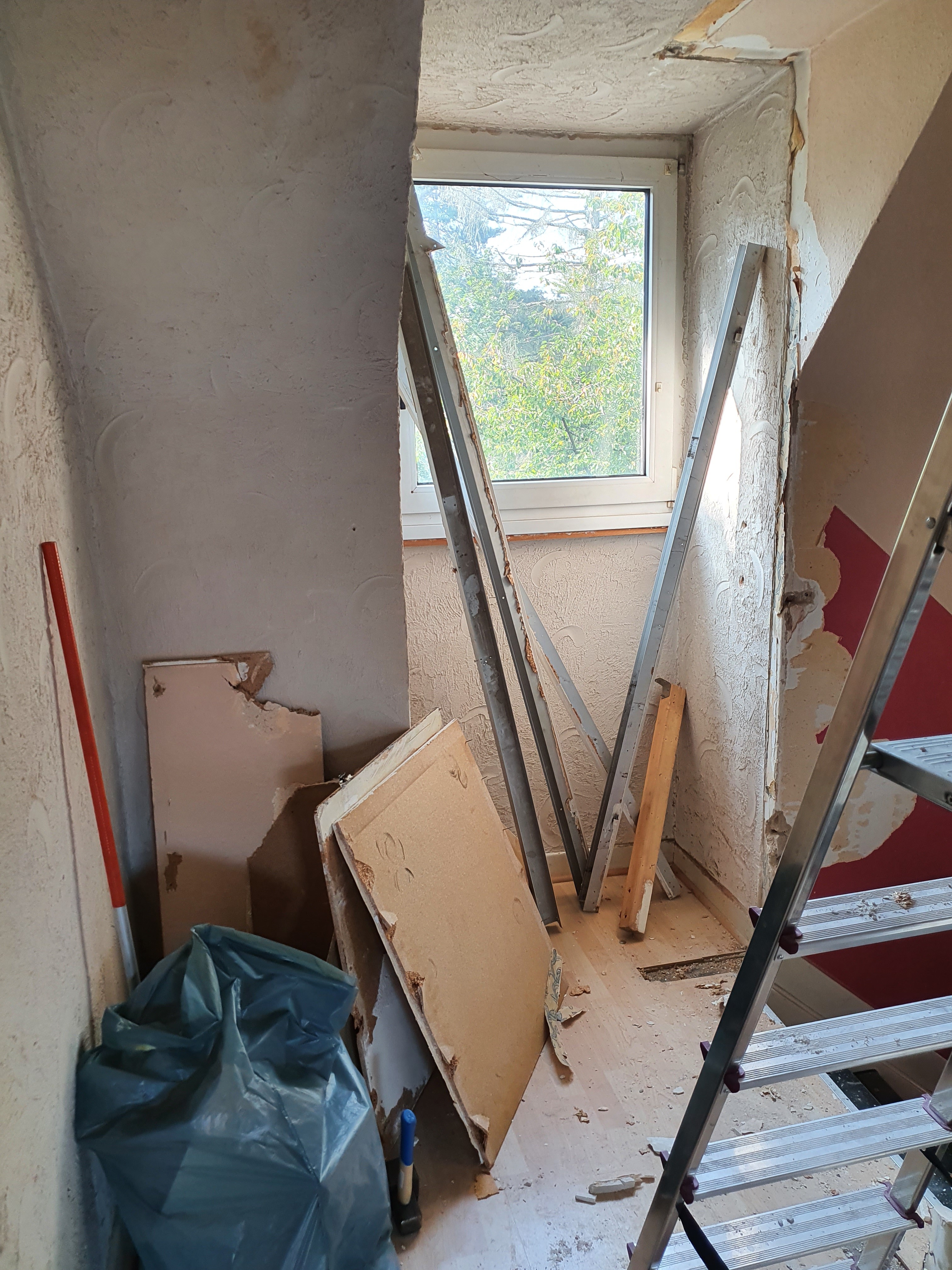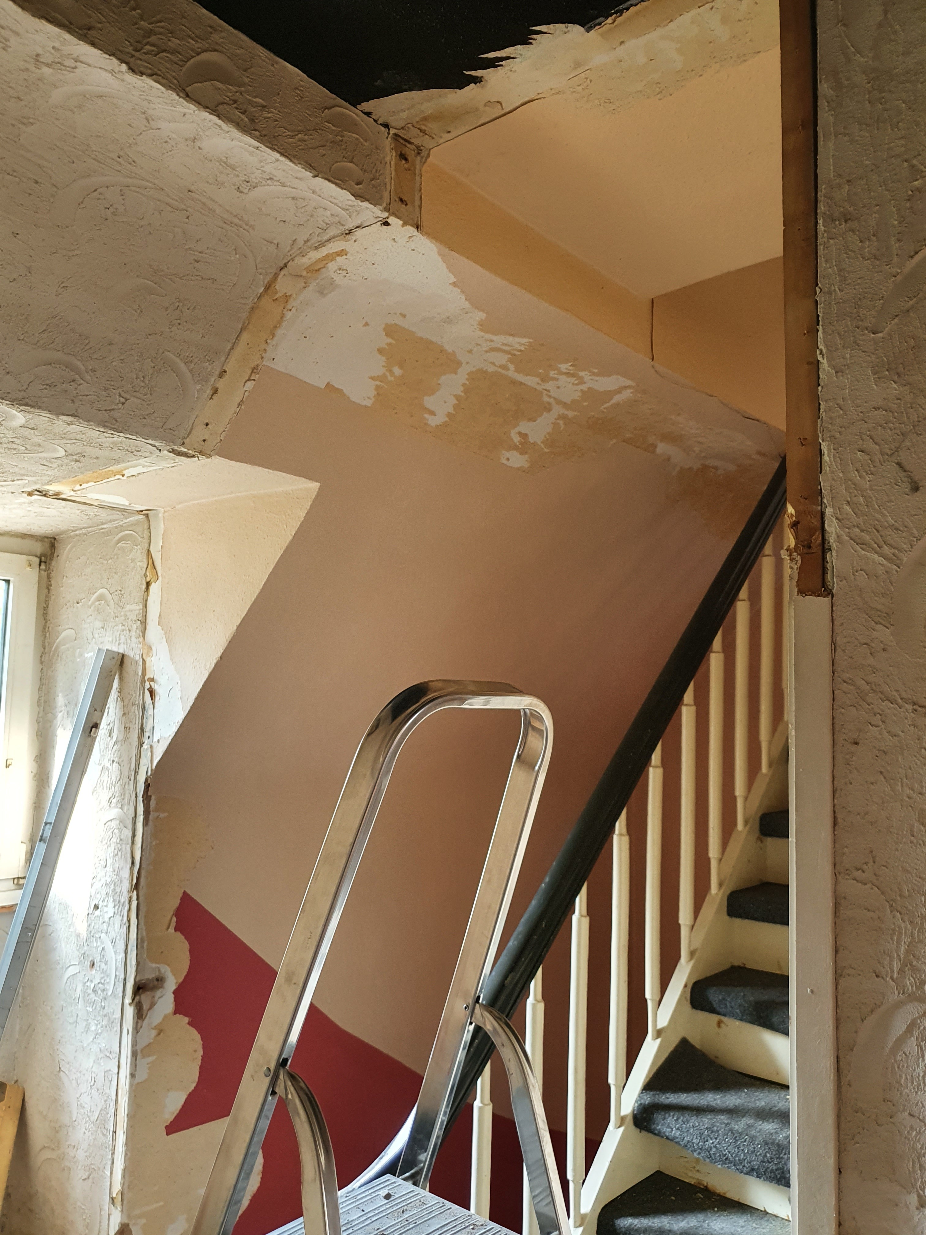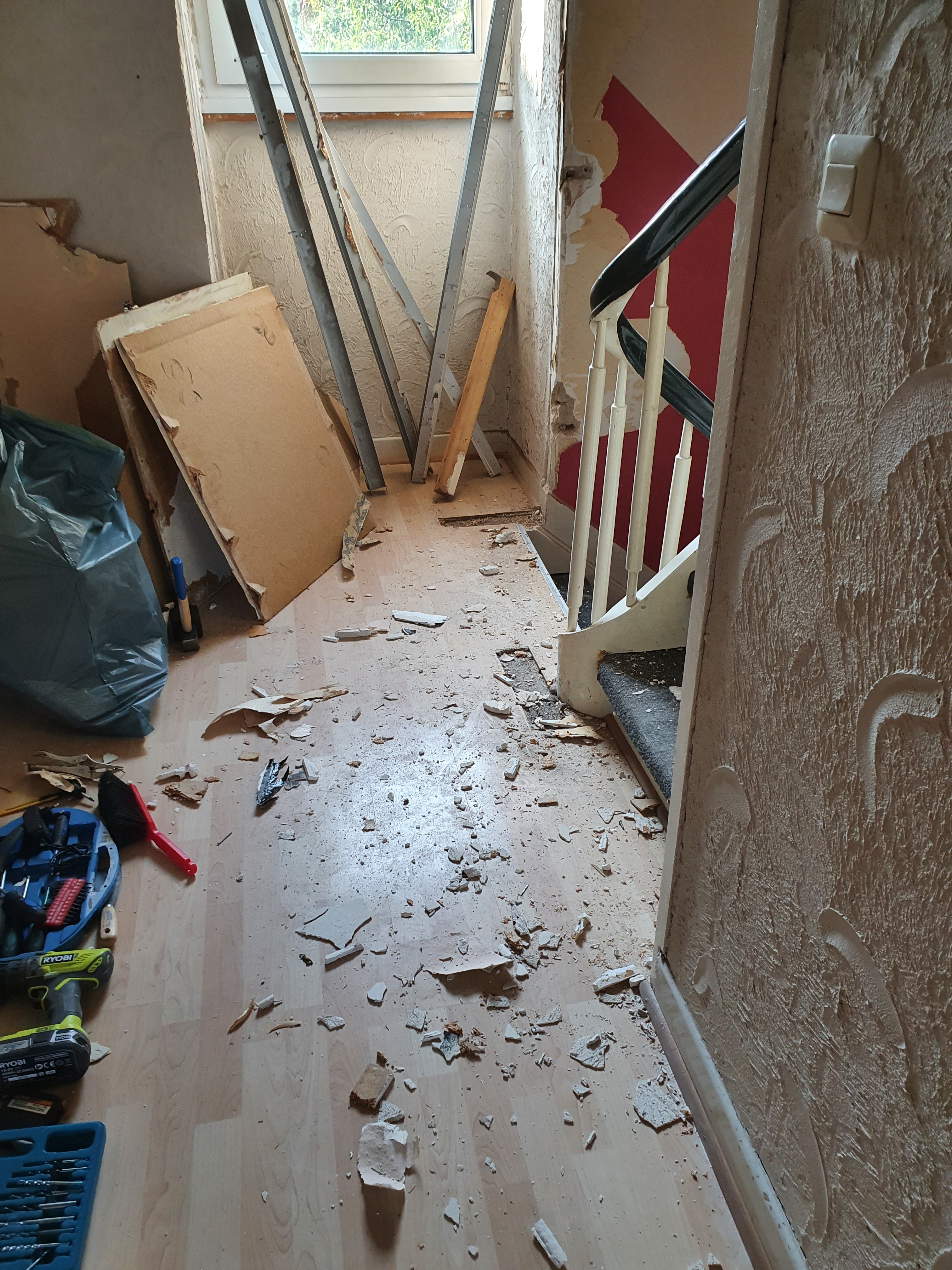 The boards at the top of the frame were tacked onto wooden blocks, which in turn were bolted into the ceiling with 15 cm bolts. Nothing else to be done but work the boards loose with a screwdriver and pliers on one side. Then our trusty friend the lump hammer could deal with the other side and the bolts could be removed with less damage to the plasterwork than the other day.