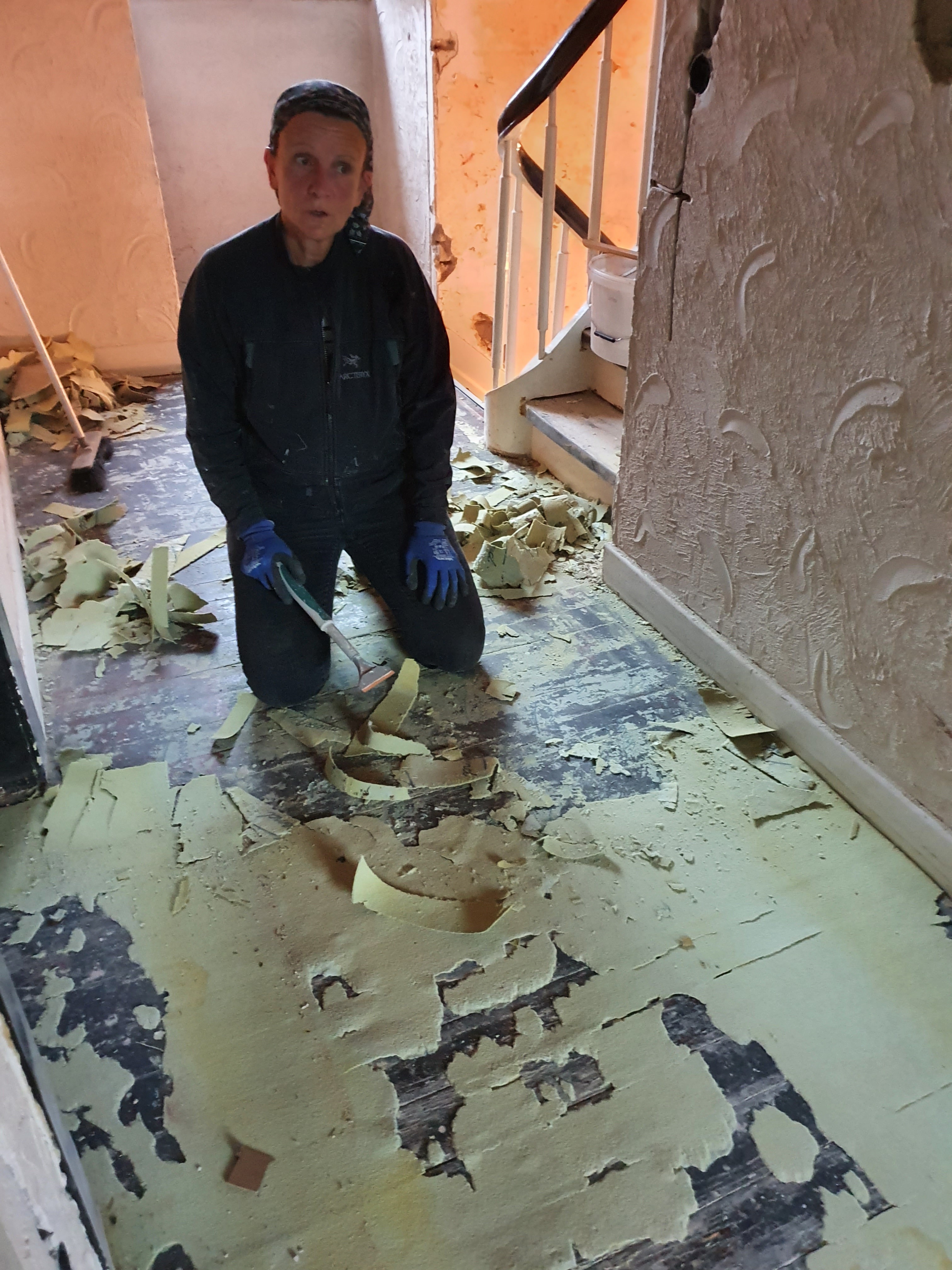 Bine got out her crow bar and got on with the job: under the laminate was carpet and below that