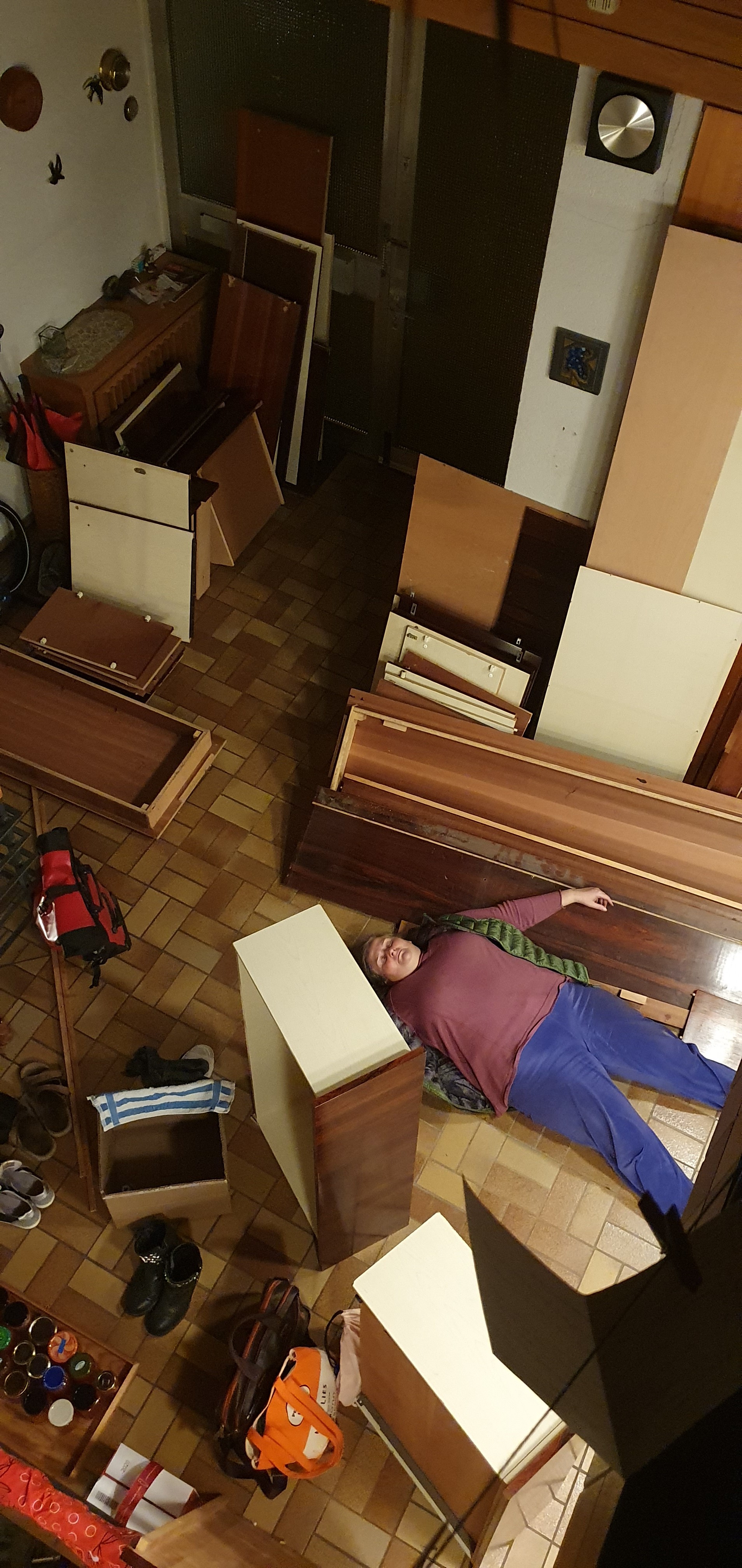 On top of everything else we had to demolish disassemble the wall unit in the play room in the cellar. It used to be in Astrid’s dad’s office and was a real beast. I got to use the screwdriver and stuff and Astrid did much of the carrying…