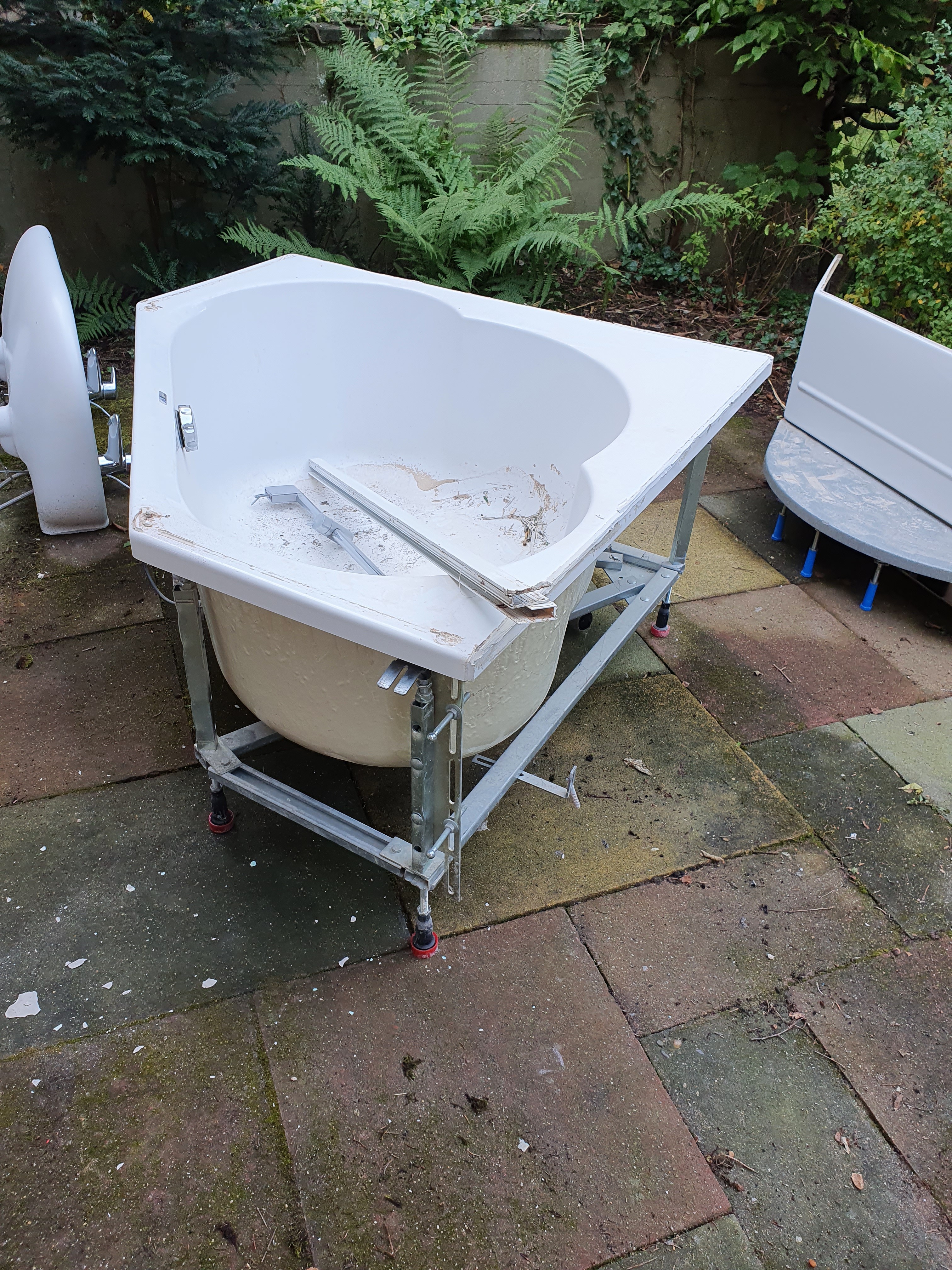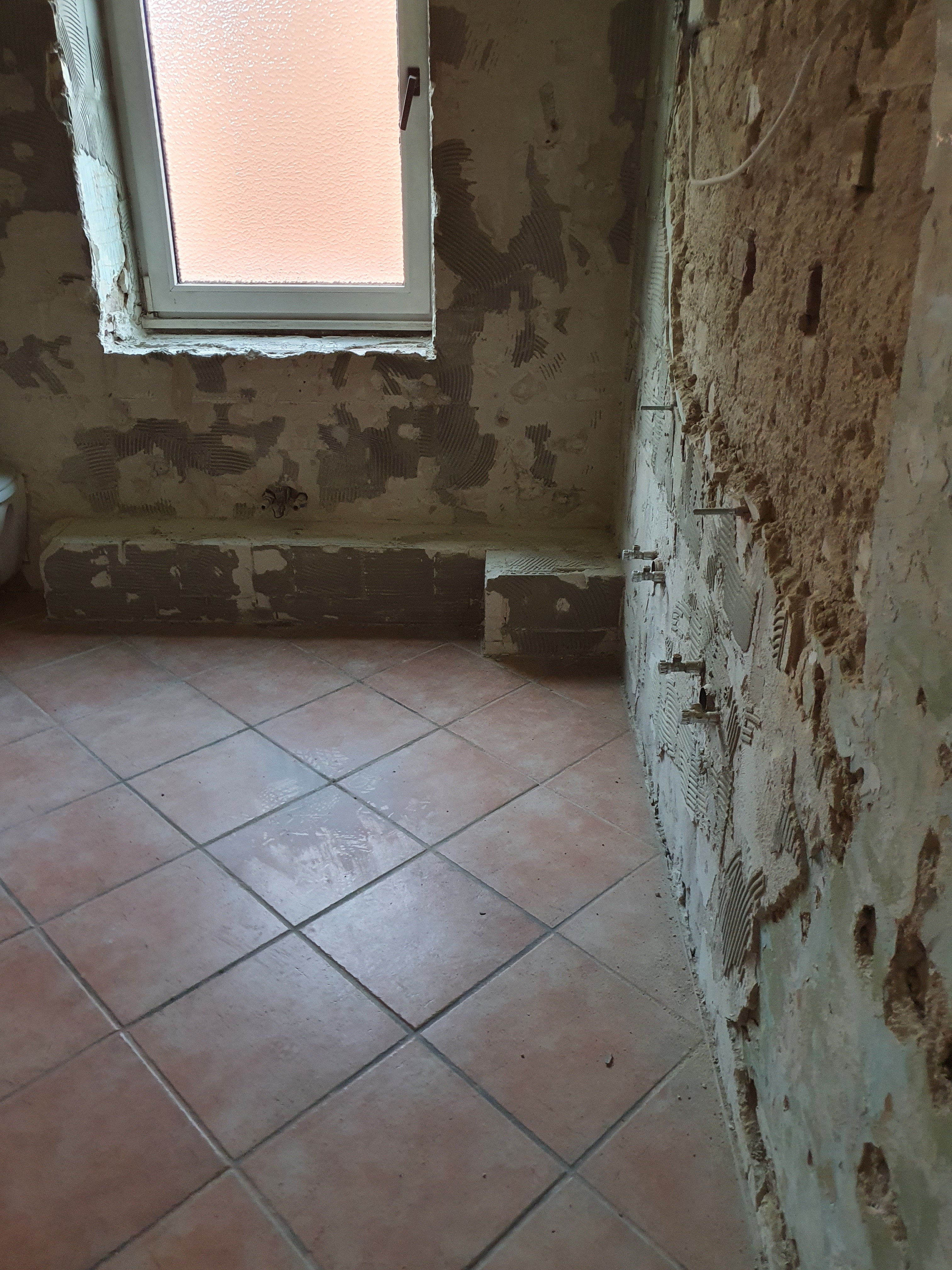 We’re not planning to finish the bathroom this year but we need to clear it out so that they plumbers can reconnect it the way it was. We’re planning to have a shower where there bath used to be and the toilet in the original position, leaving us with useful space for a cupboard. And it looks like the tiles will be fairly easy to remove.