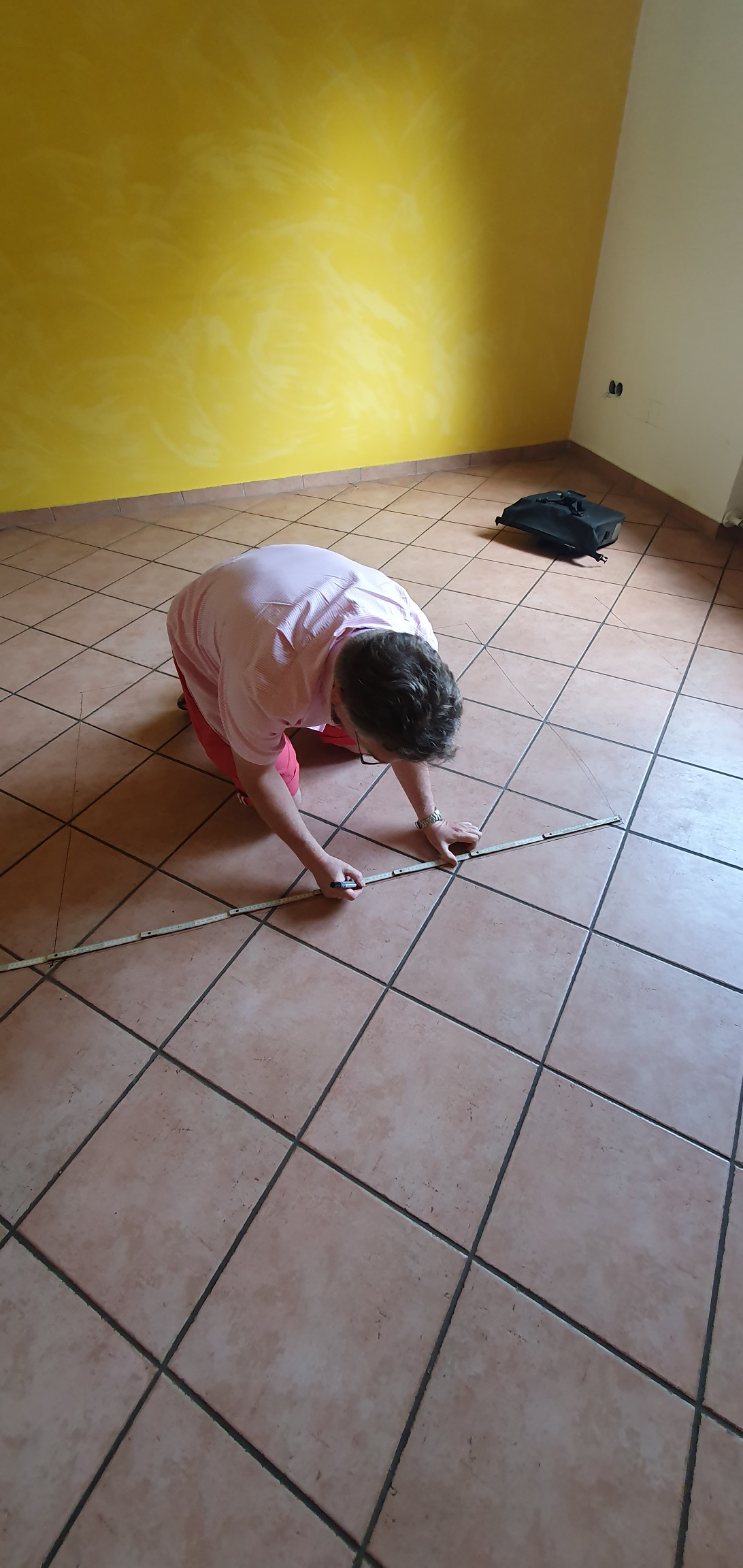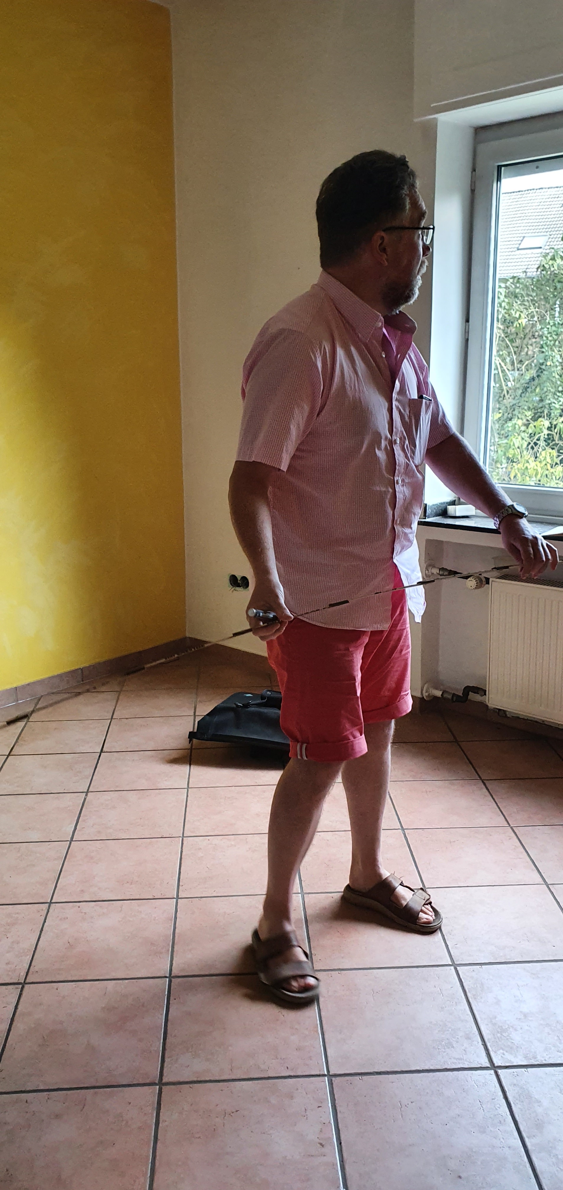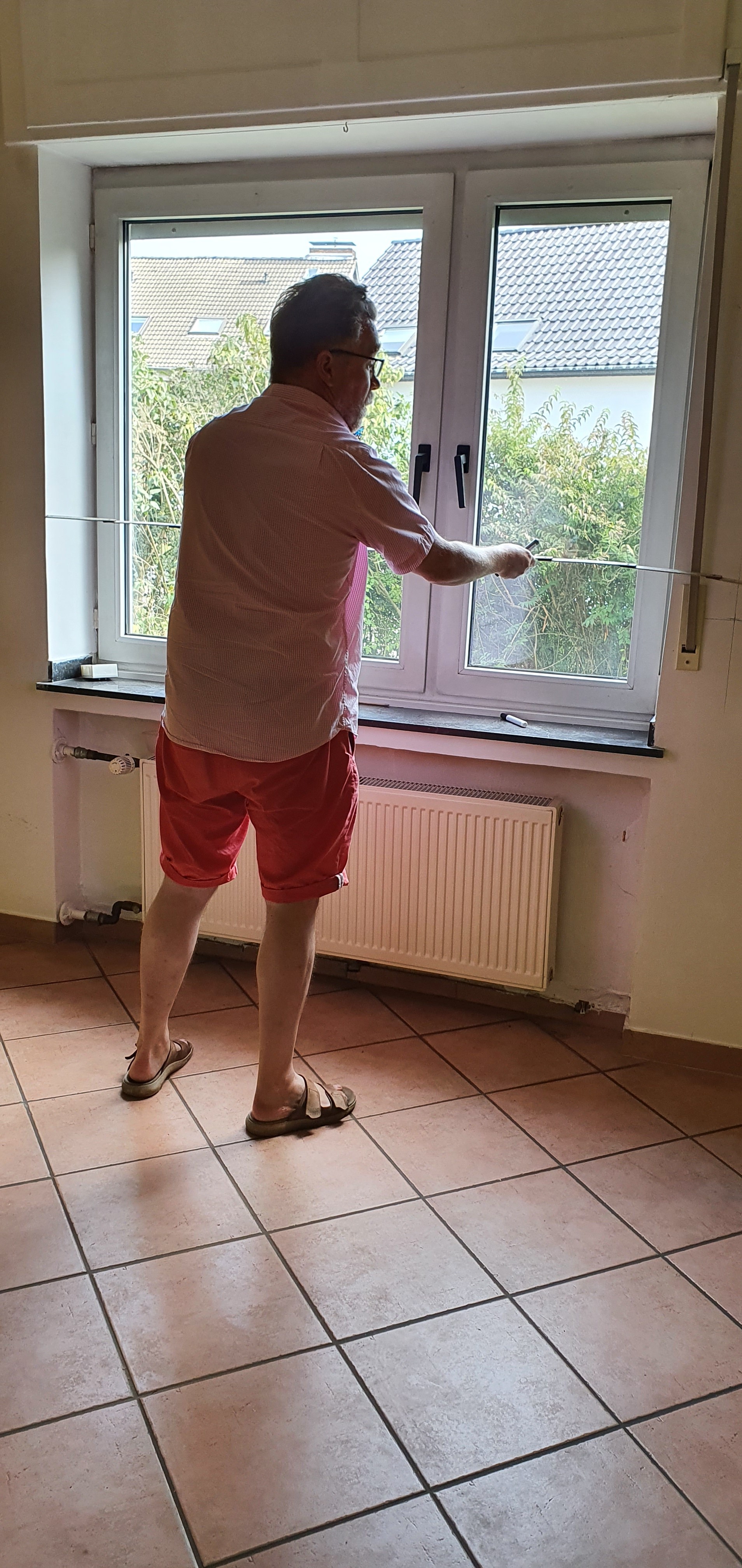 Heute haben wir ausgemessen, wo die Lampe über dem Esstisch hängen soll und wo der Esstisch überhaupt stehen soll. Hier seht ihr den Raumplaner bei der Arbeit.
