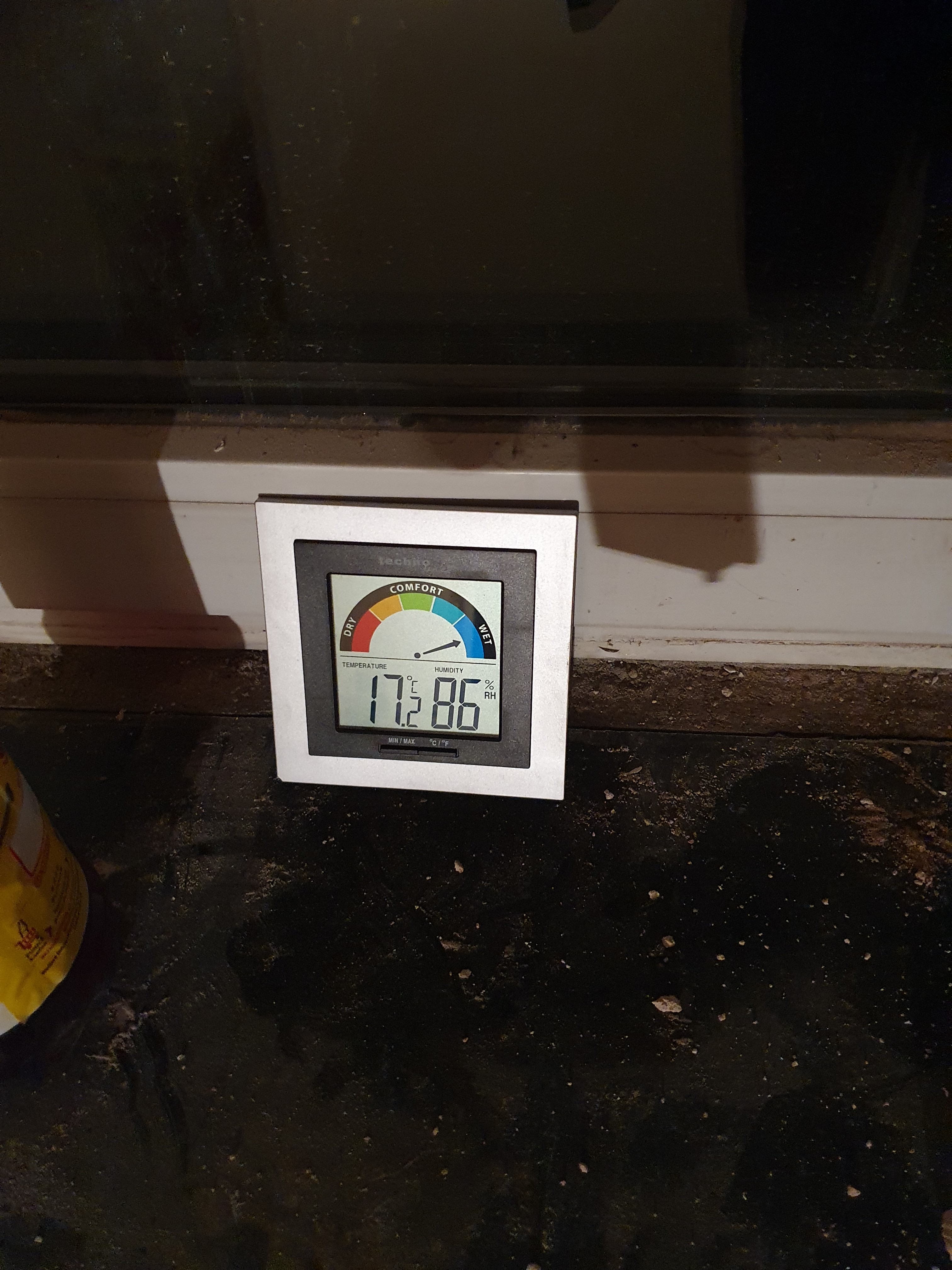 When I came back in the evening the temperature was up to nearly 18°C. All the work of the gas heater and very much just hot air, but as long as it moves the humidity, that’s fine. And there was very little condensation downstairs. Also the hole for the wood stove’s chimney was blocked up, making it any warm air has to do more work to escape. Vented again and opened one of the ventilation slits in the roof and rely on physics.