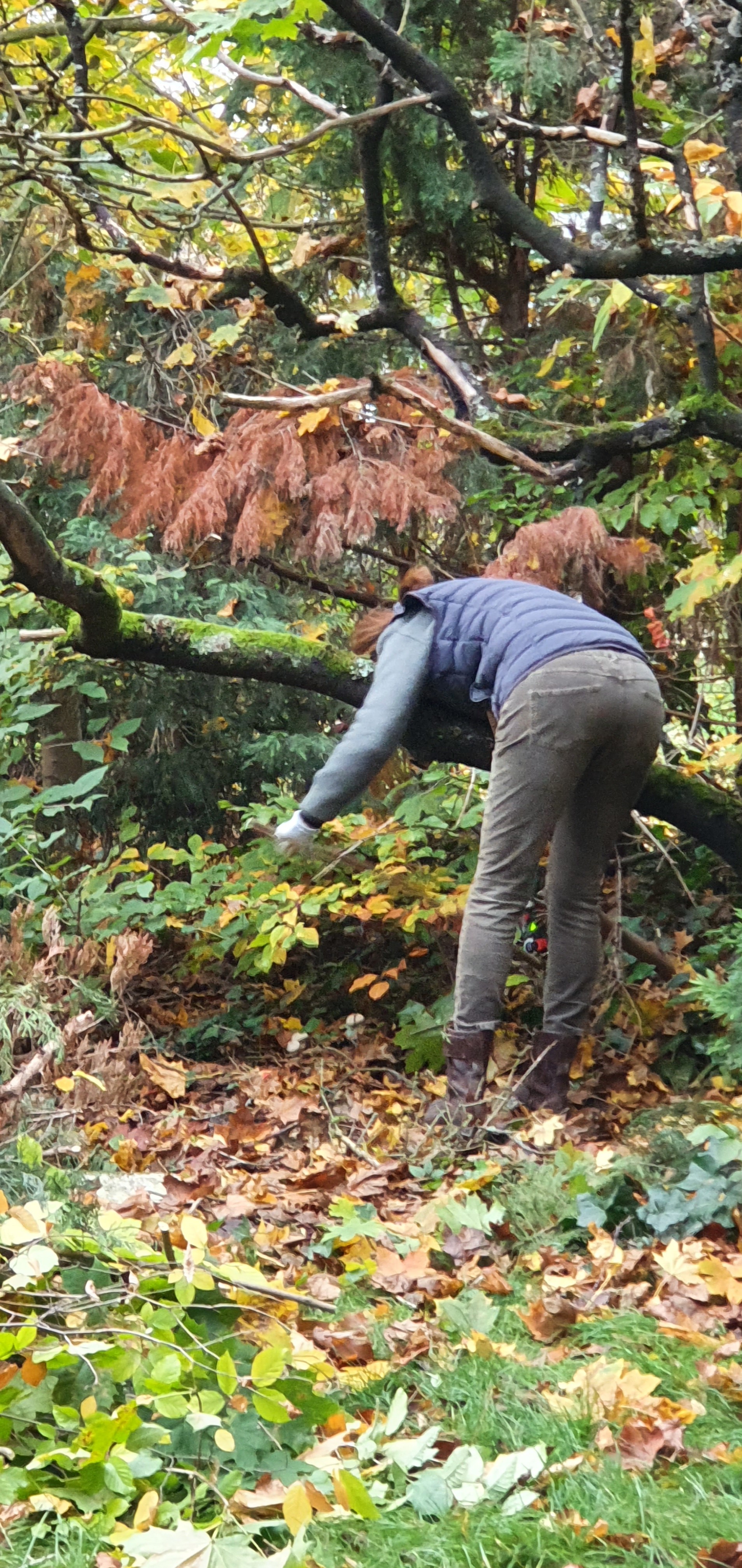 Im Hinterland des Sengelsweg wurde seit Jahren nichts mehr geschnitten. Die Bäume und Sträucher wachsen untereinander, in einander und vor allem sehr durcheinander. So schneiden wir Ahornzweige, Essigbaum, Buchen, Kirsche und Brombeere zurück. manches kann man weder unterscheiden noch von der Art her richtig erkennen.