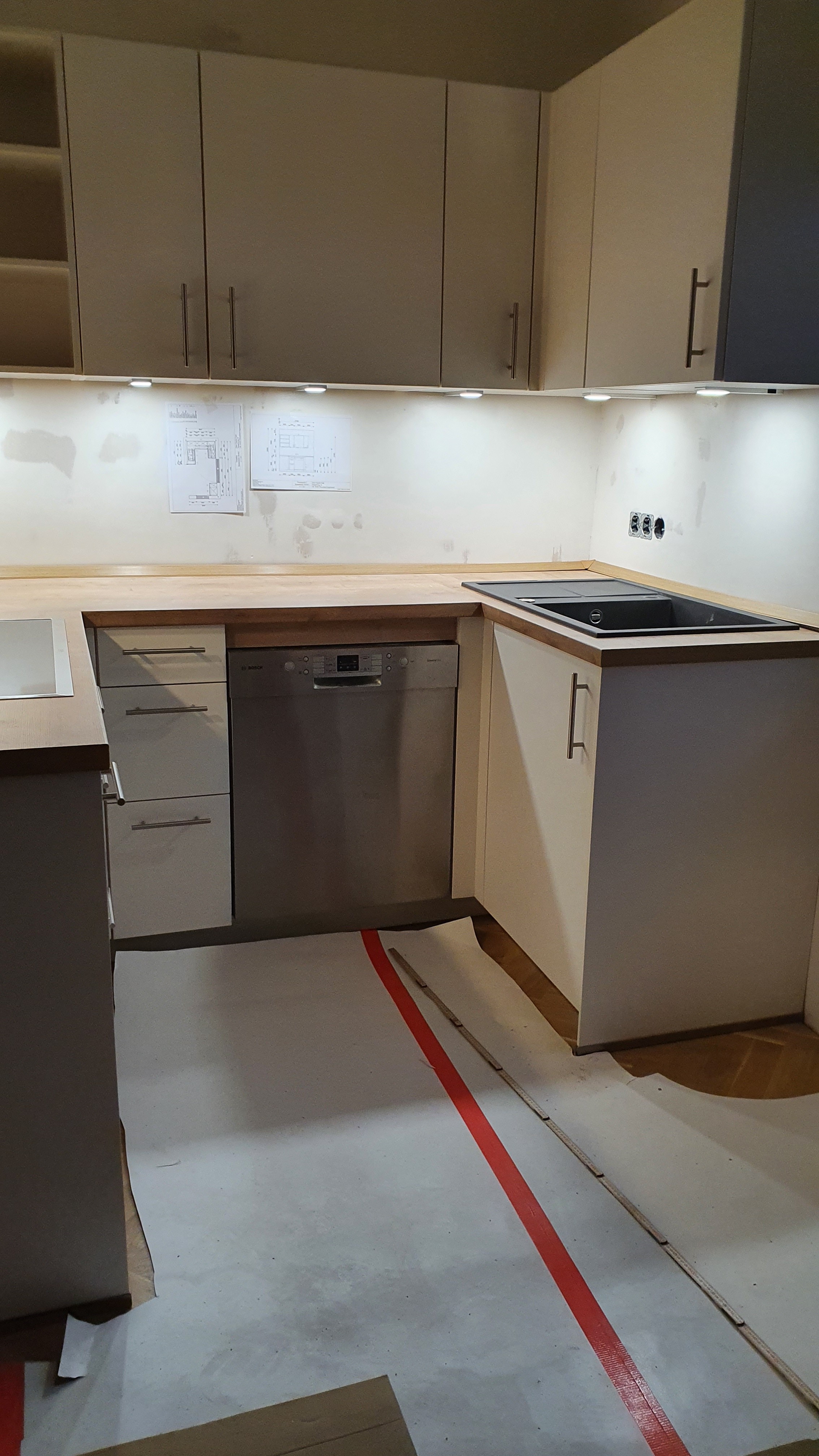 The eagle-eyed may have noticed the missing tap. The idea was, and still is, to use the extendible tap from my old kitchen. But, due to some zealous tidying in the cellar and fatigue when taking out the trash, we lost a bit. Hopefully, we’ll be able to fix this. Otherwise, we’ll have to find a replacement.