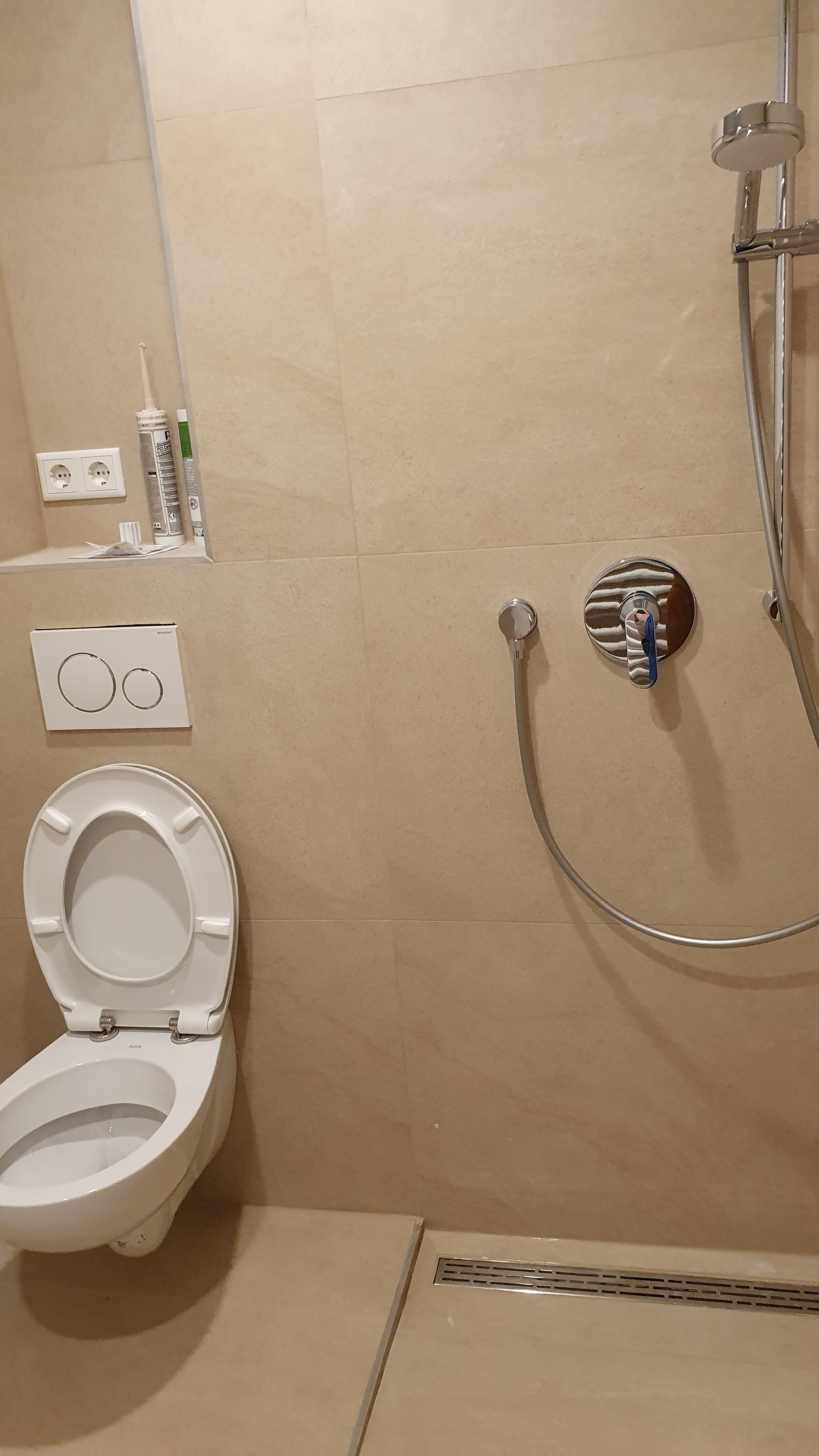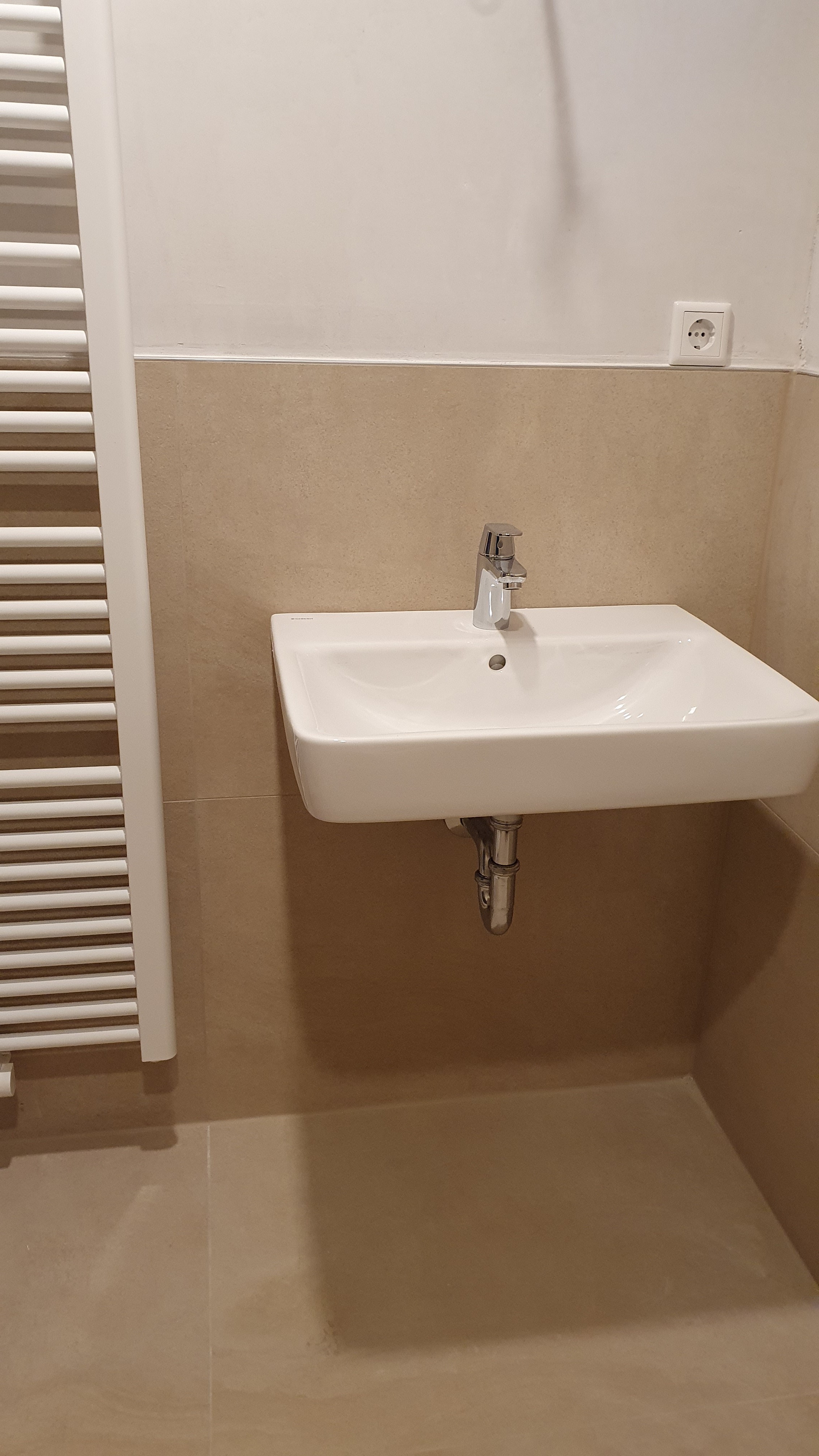 Yesterday afternoon Mr Peters was already busy in the bathroom. We now have a working toilet, shower washbasin and heating! Okay, we can’t really use the shower until the glass has been installed, which won’t be until Tuesday. Until then we’ll still shower in the Waldlehne. But the downstairs bathroom has heating for the first time ever!