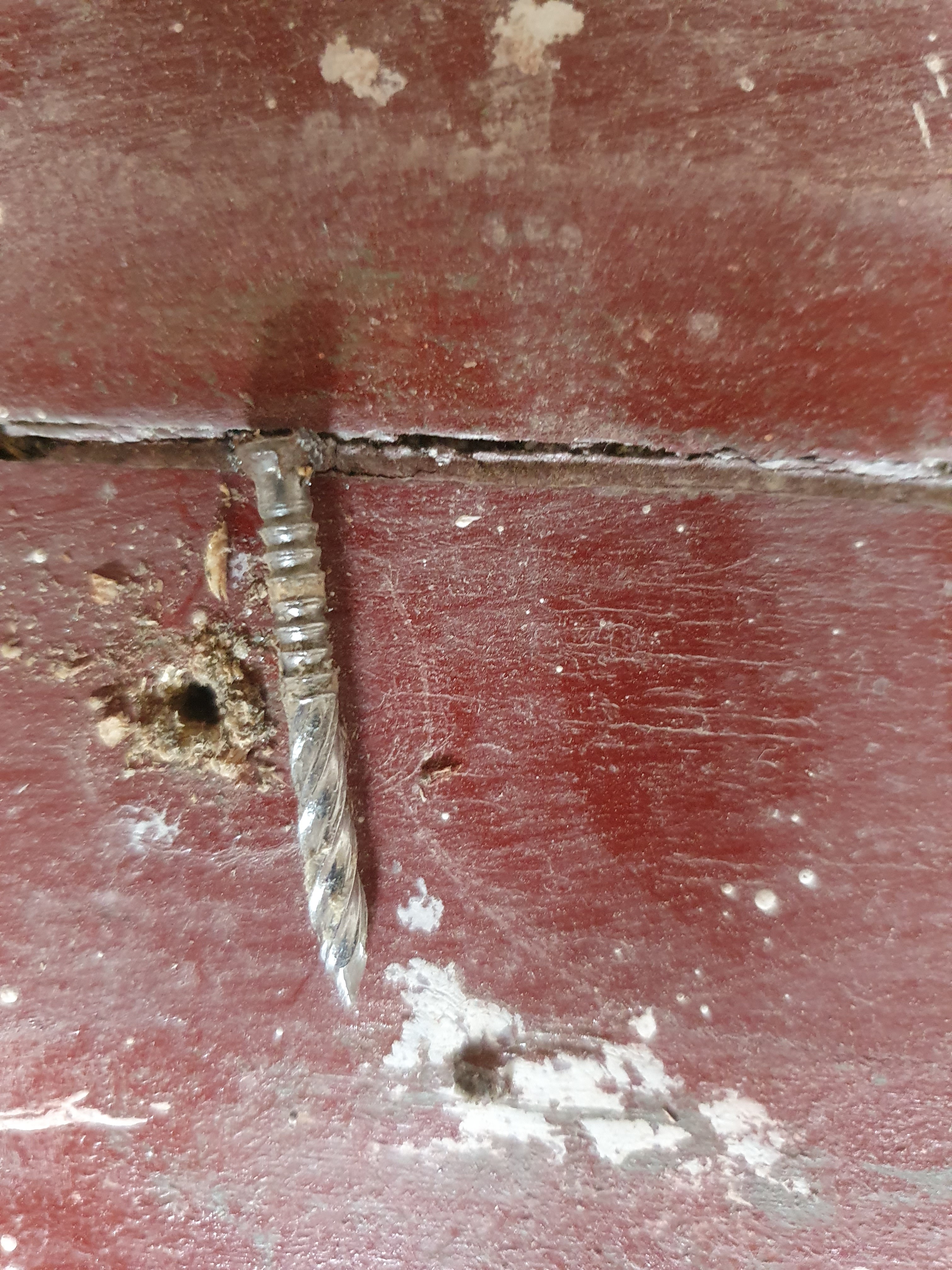 But there’s always one. And the screwhead broke almost immediately. 🤬 We’ll can’t just cut it off because that will still leave enough to ruin any sander. I think we’ll have to try and drill it. Maybe our intrepid midnight decorators will have some ideas.