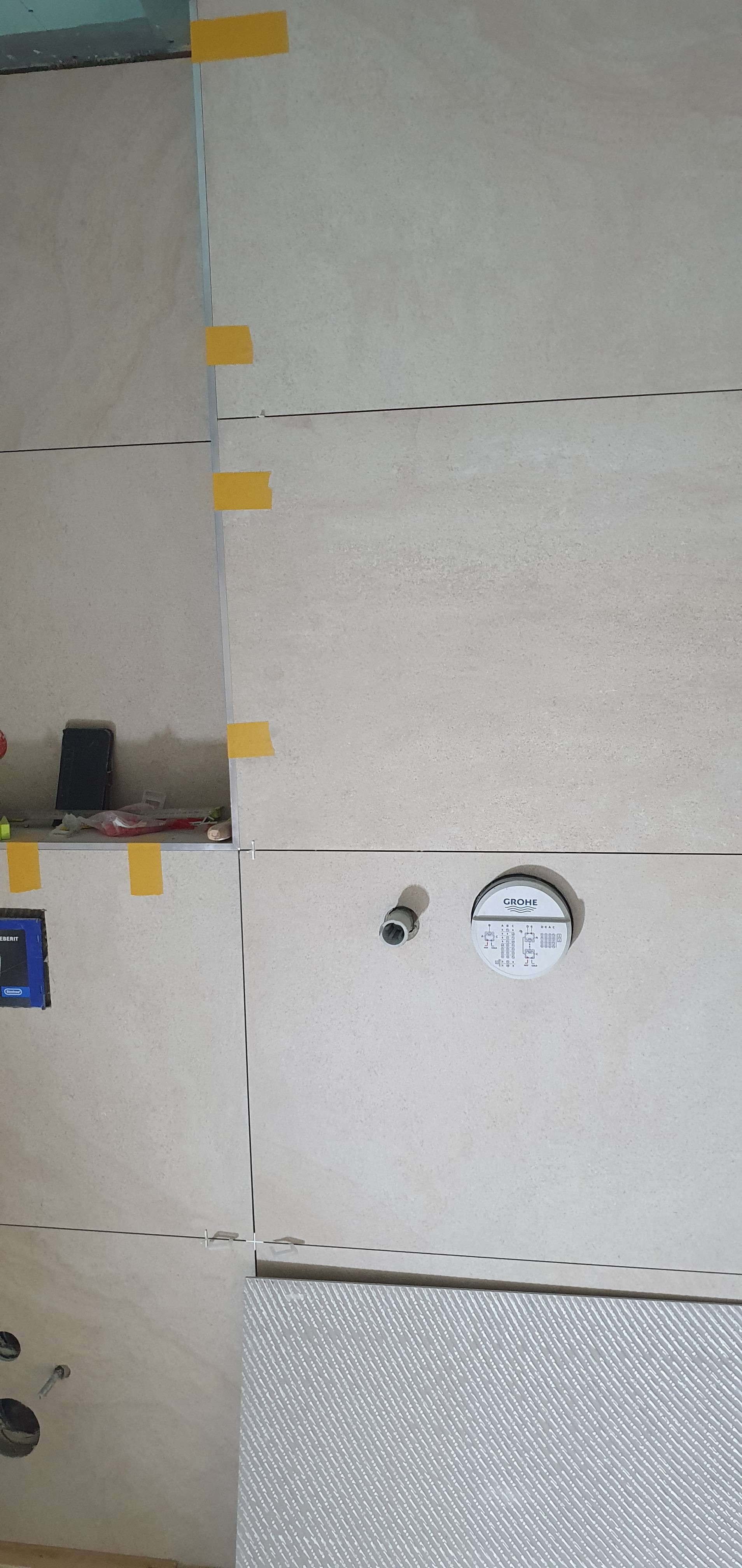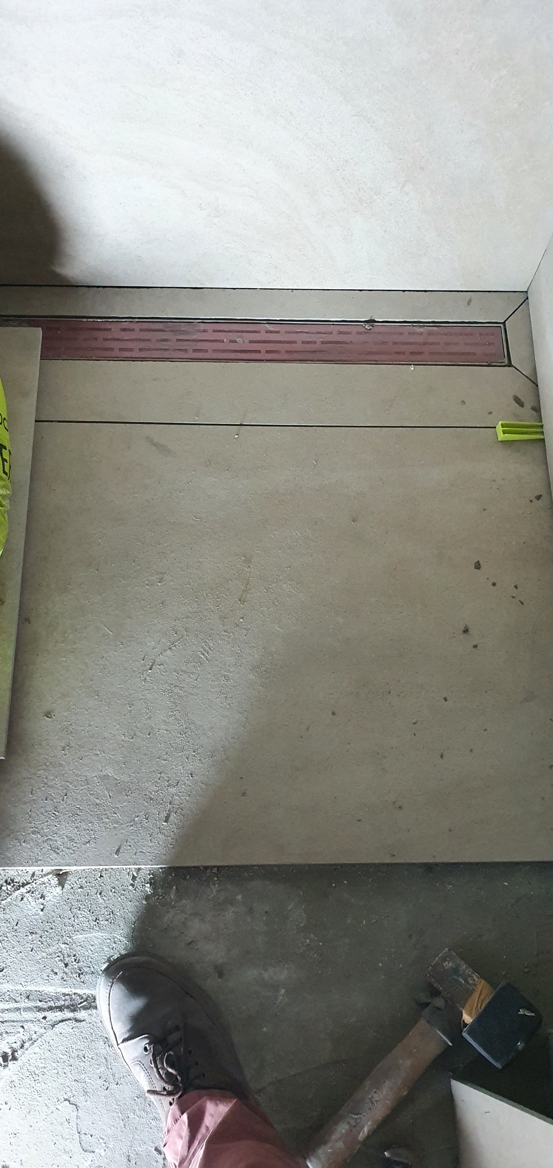 However, in our excitement we’d forgotten that the shower wall has to be mounted on a completely flat tile and a anchored into the real. But we’ve only tiled all the way up the wall on the right hand side. This means that either the wall can be mounted on the tile but have no wall at the top, or, it can be mounted against the wall but hang over the slope. Five minutes discussion between Mr Sauer and Ivan and we had a solution: we will mirror the cladding on the left of the room and will thus be able to mount the wall both on the floor and against the “blind” cladding. It’s not perfect, but it will have some symmetry and should look okay, and most importantly, it will work.