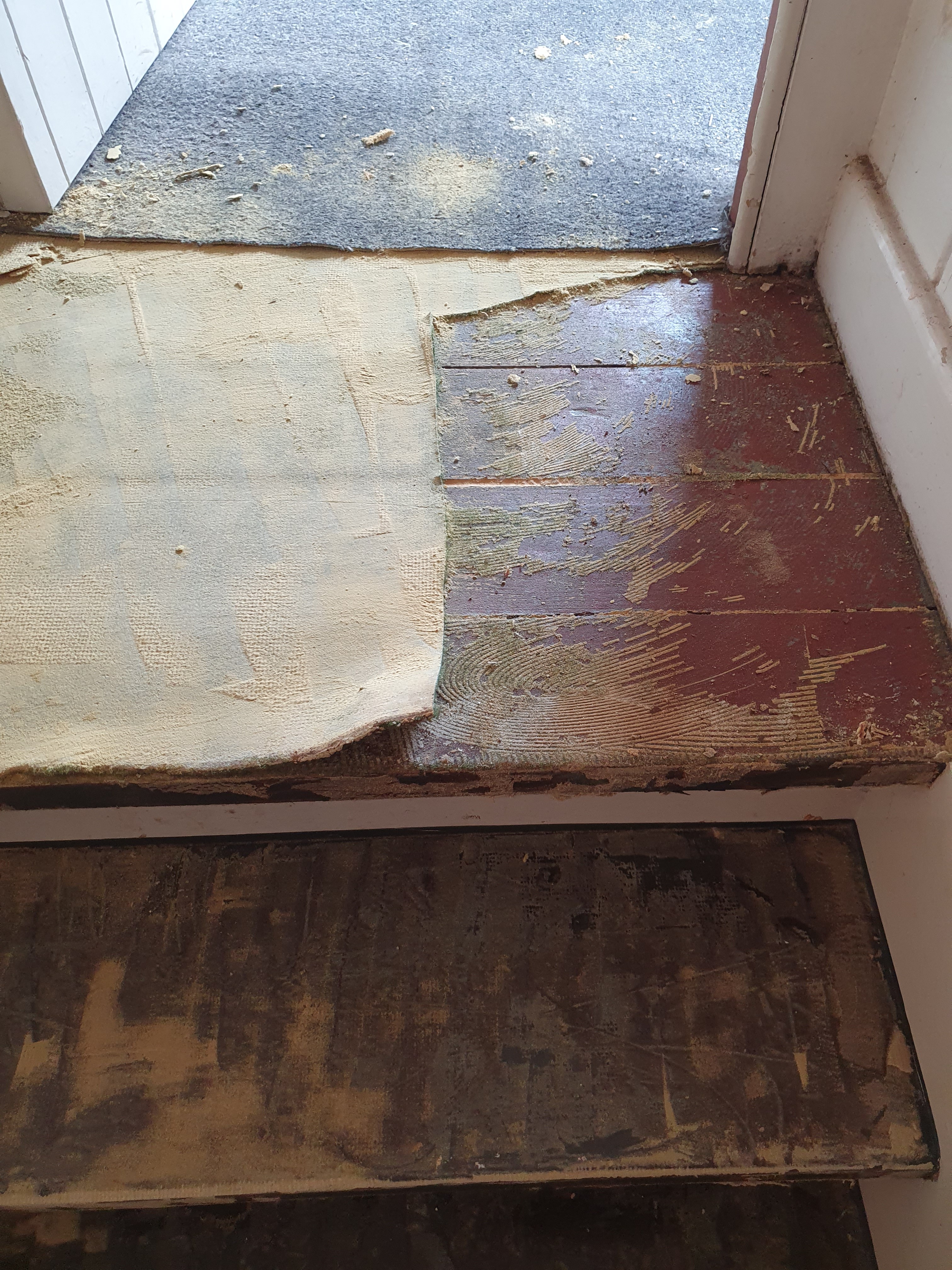 I got lucky: the carpet is every bit as cheap and nasty as it looked. So, where it wasn’t already lose it was just a question of cutting through with a carpet knife and peeling it away from the underside. This could then be fairly easily scraped and then swept away.