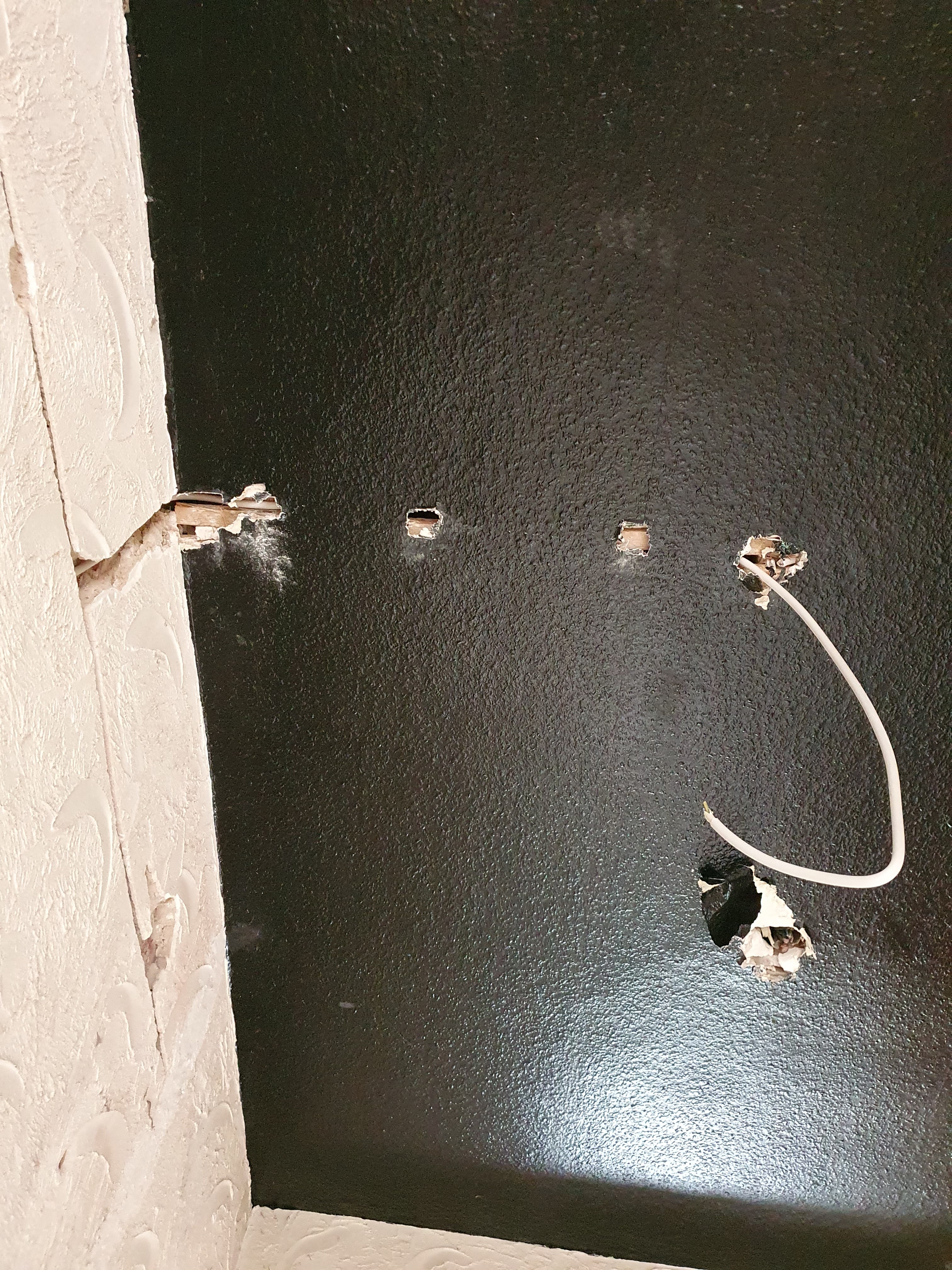 Water repellent black gloss paint on the ceiling of the upstairs hall. Oh, what fun it’s going to be taking that down!
