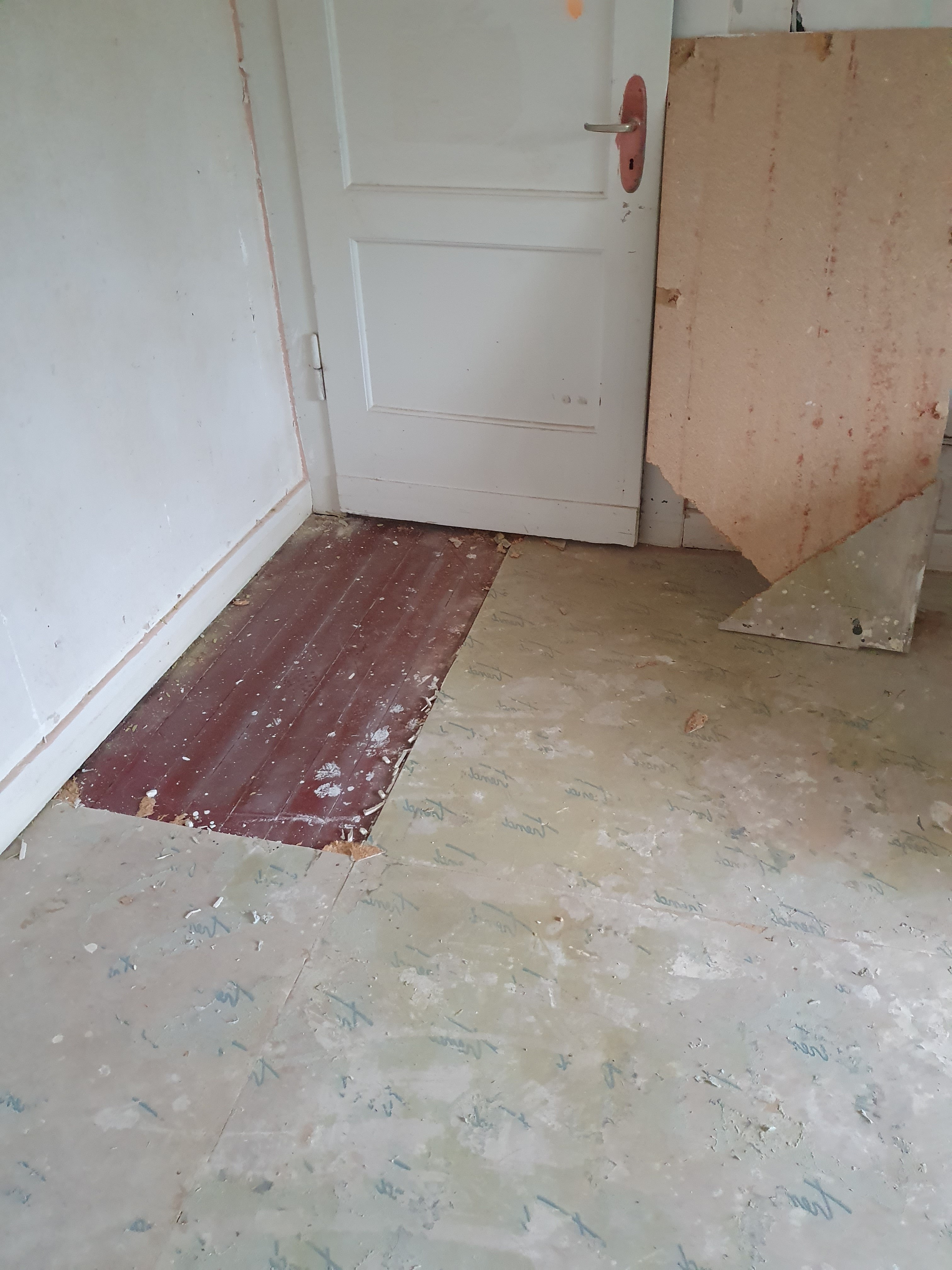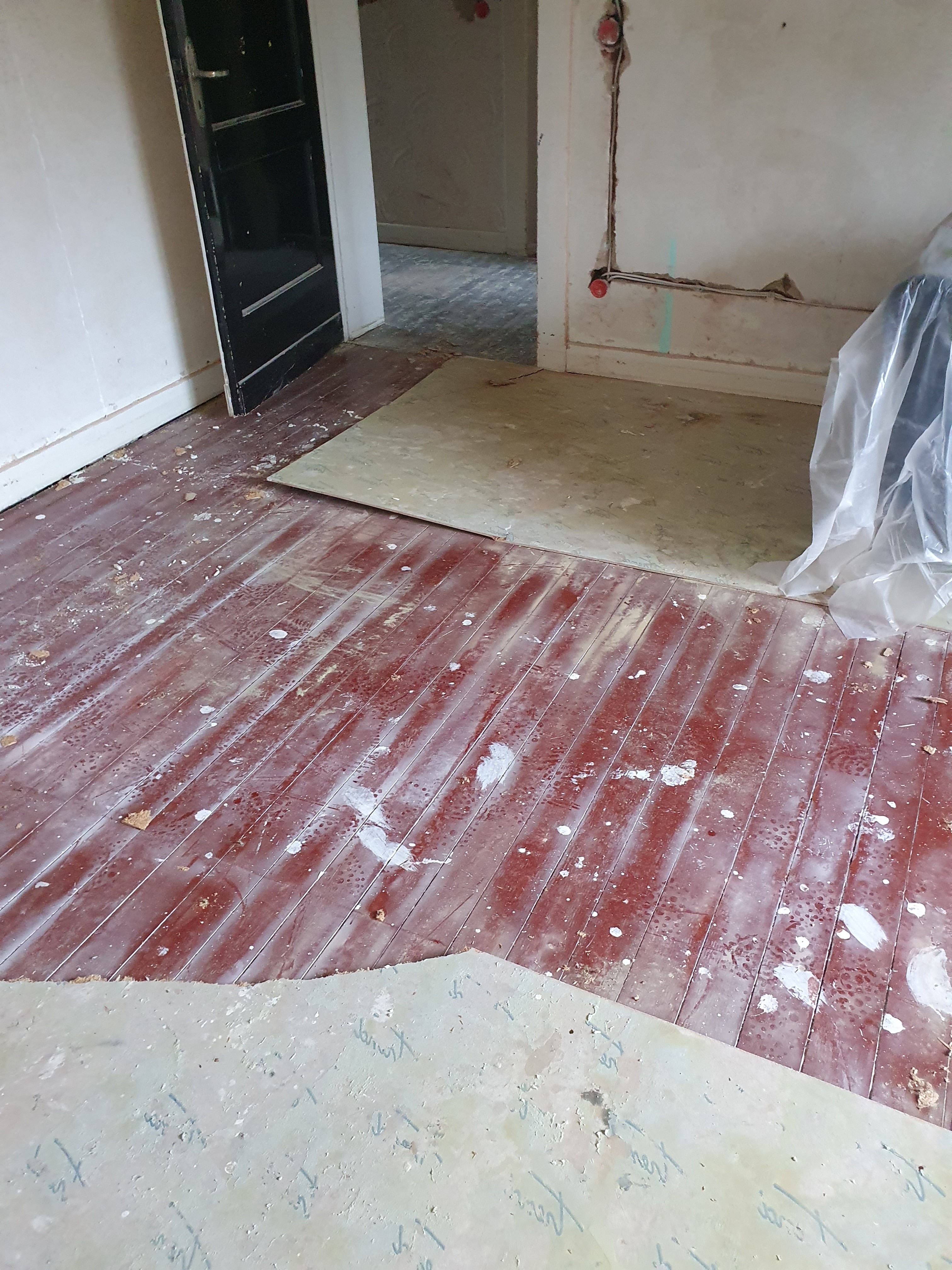 The B Team got stuck in traffic, taking two hours for a journey that normally takes less than half that. And when they arrived I had to leave, in order to smash up a cupboard and put it out with some other stuff for special collection tomorrow morning. But they decided to take another go at the study floor in the hope that it, too, is largely screwed or nailed down and not glued.