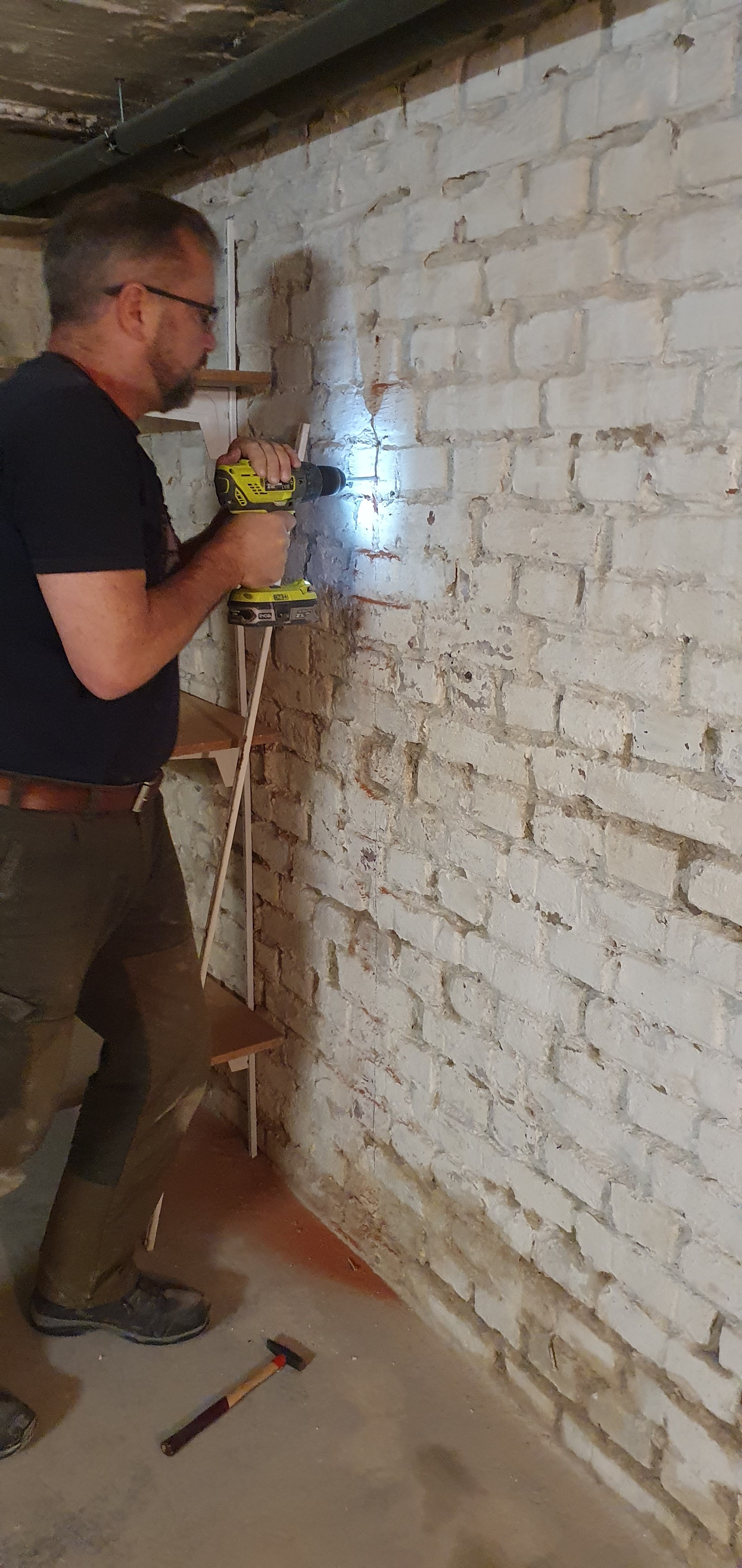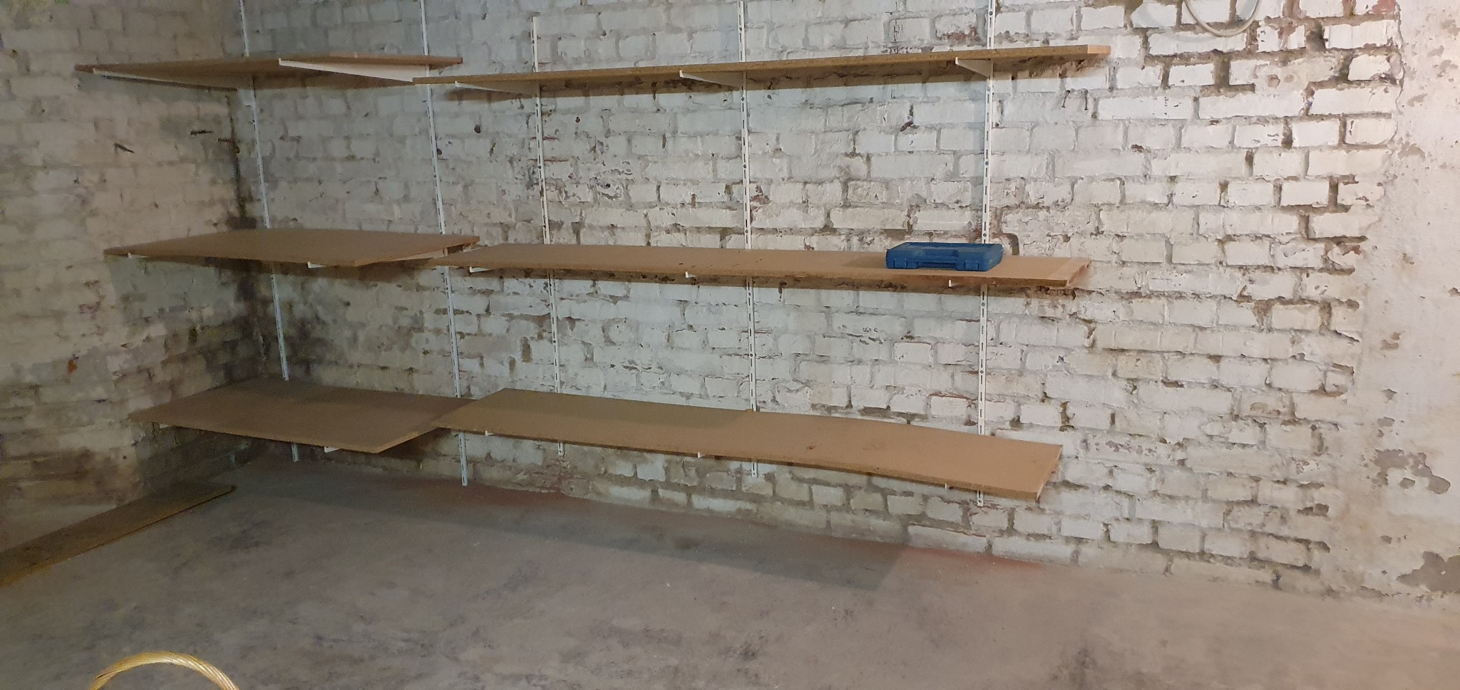 The cellar traditionally had a pantry under the living room and we’ll be using at least part of the space for storage. We’d already moved some ladder rack shelves from the Waldlehne and today it was time to set them up.