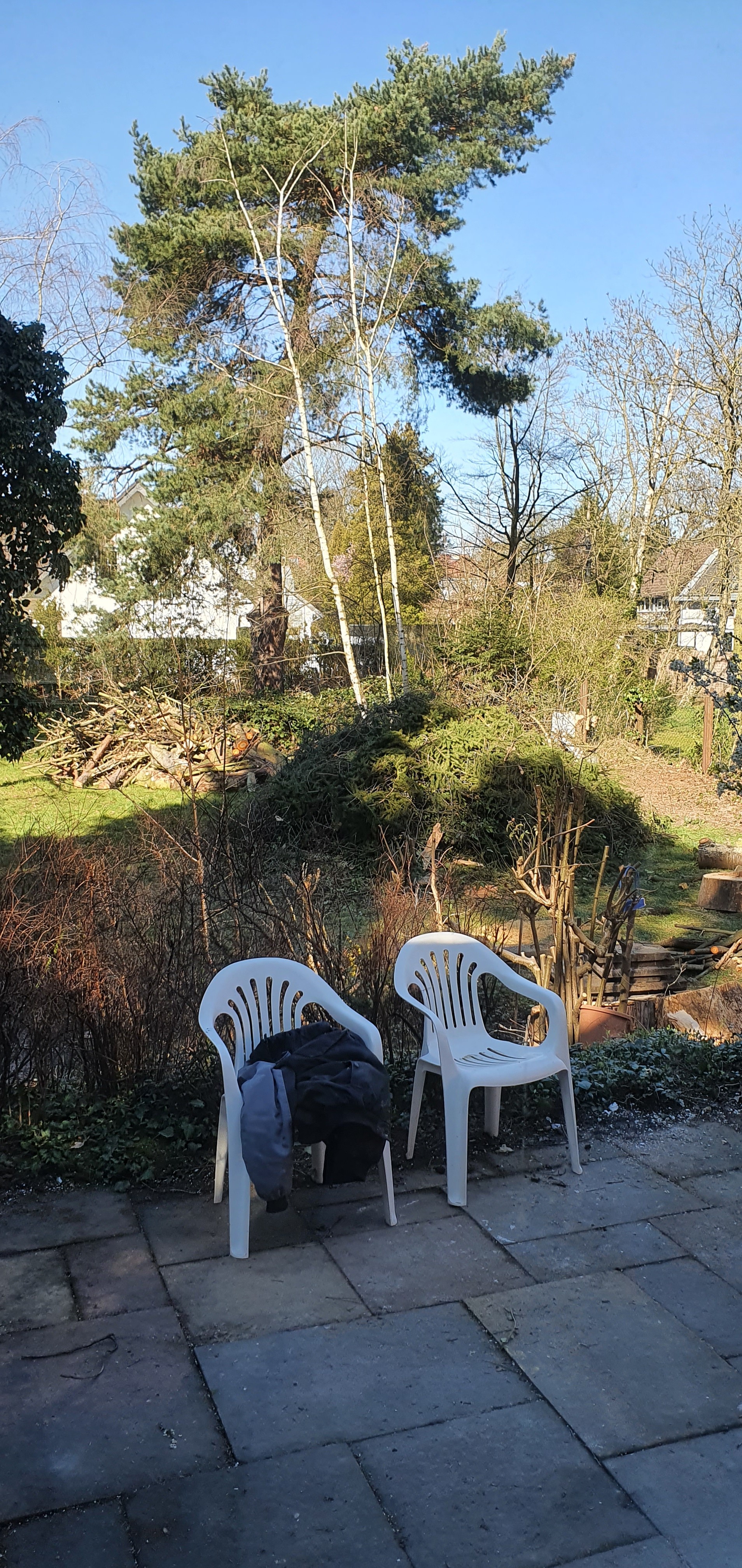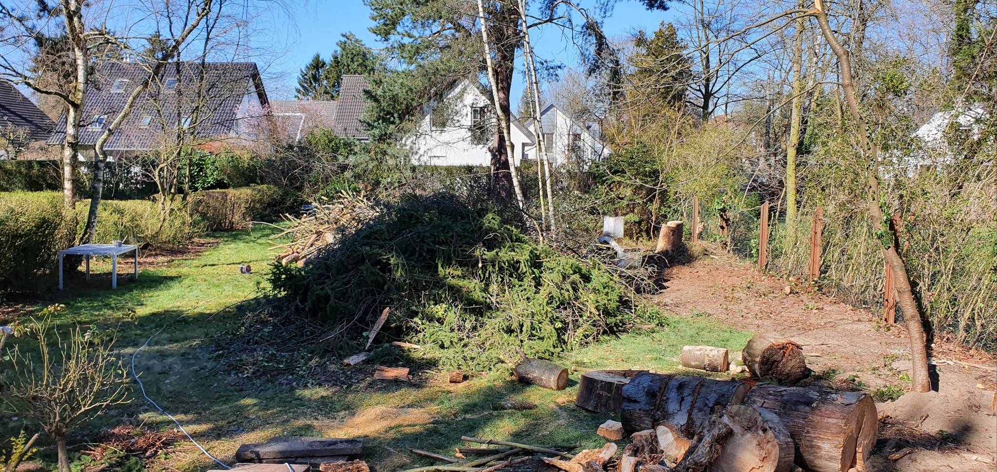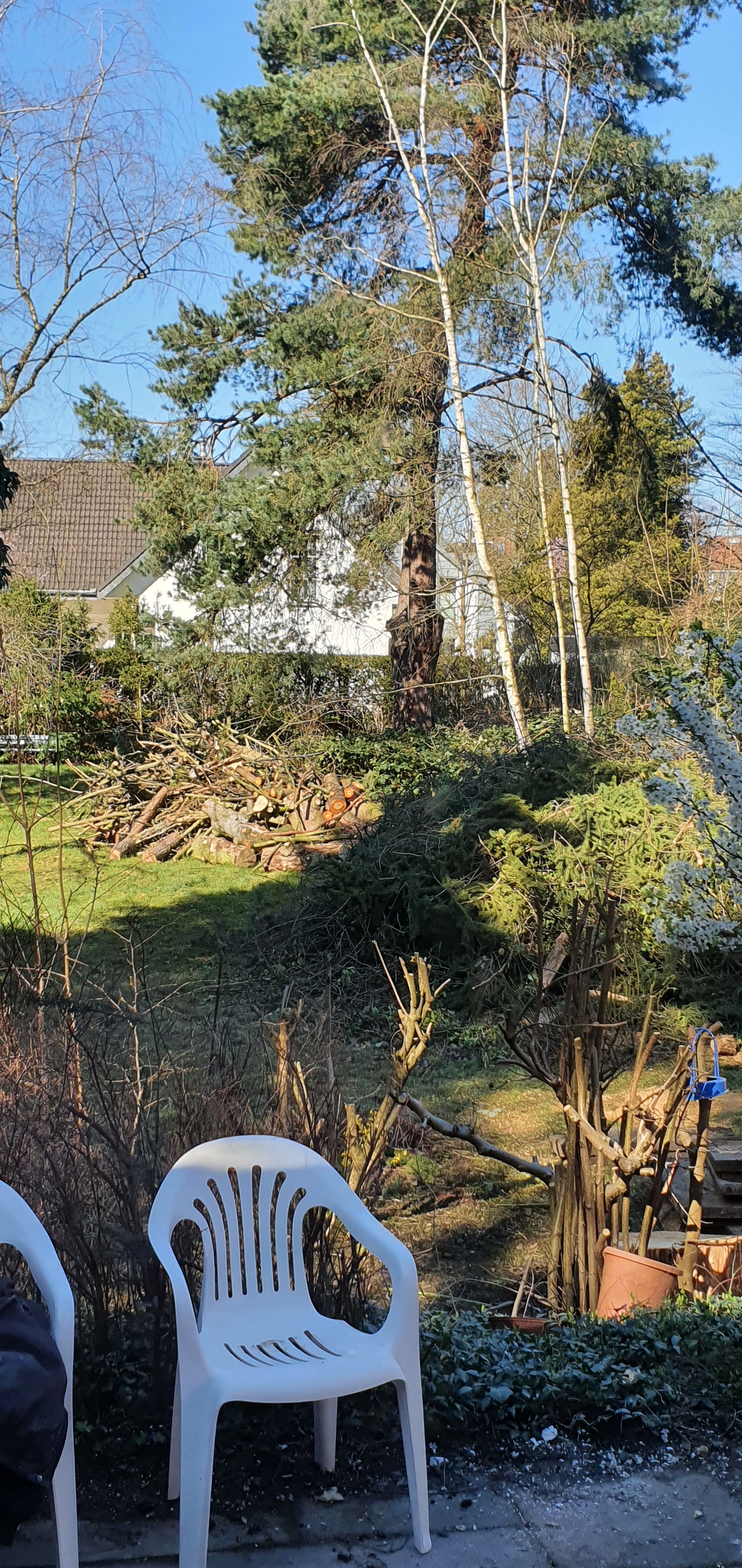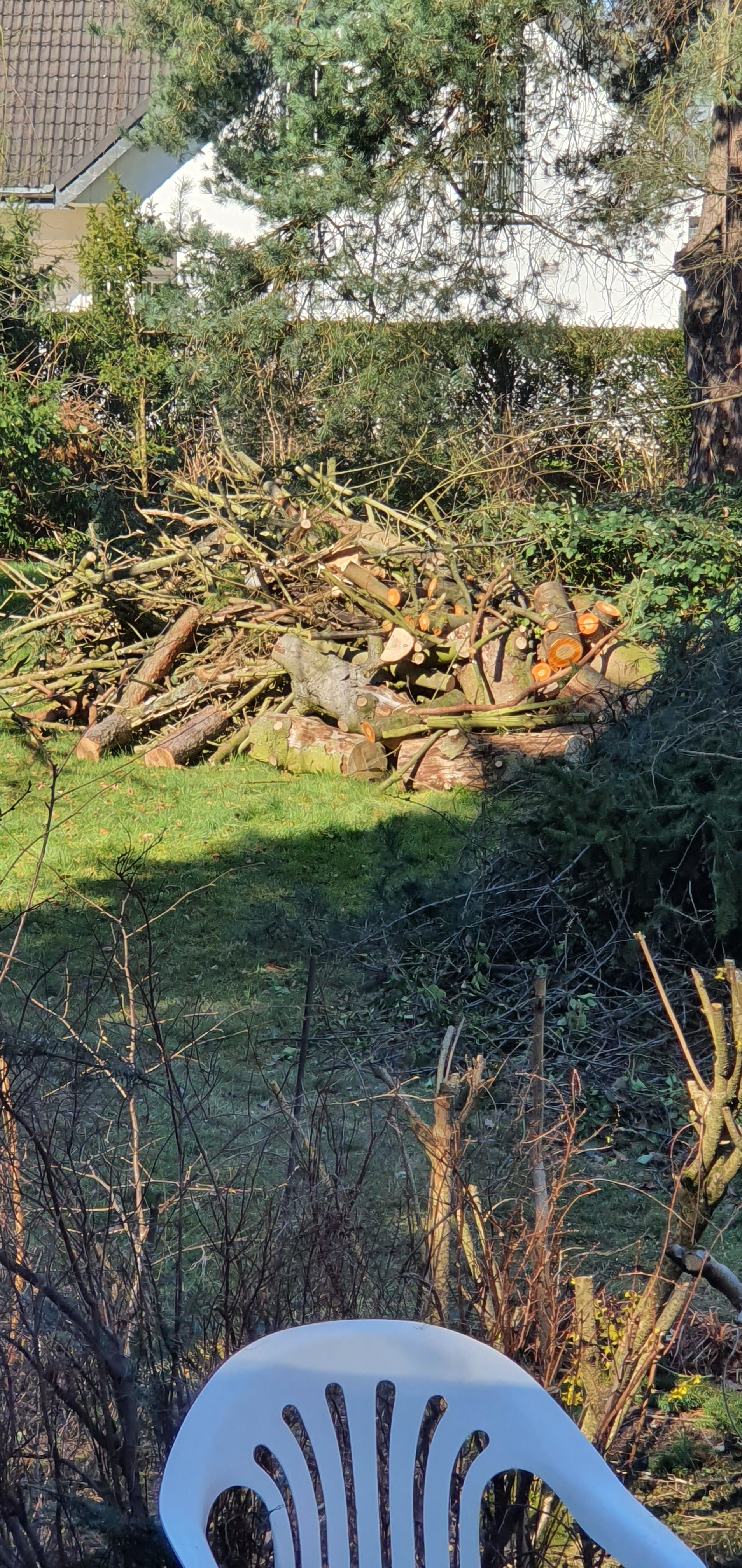 Ferner möchte ich sagen, dass der Garten jetzt sehr schön gelichtet ist. Wir können im Umkreis von 50 Metern bis zu sämtlichen Nachbarn sehen. Umgekehrt ist es allerdings auch mit unserem “Heckenschutz” vorbei. Es türmt sich ein riesiger Berg Gehölz und Geäst im Garten. Und, meine lieben Freunde der gewachsenen Baumkultur, die Herrschaften sind ja noch nicht fertig und planen weitere Kettensägenattacken. Sollte hier irgendjemand auch Mal Mitleid mit mir haben, schreibt mir eine Postkarte.